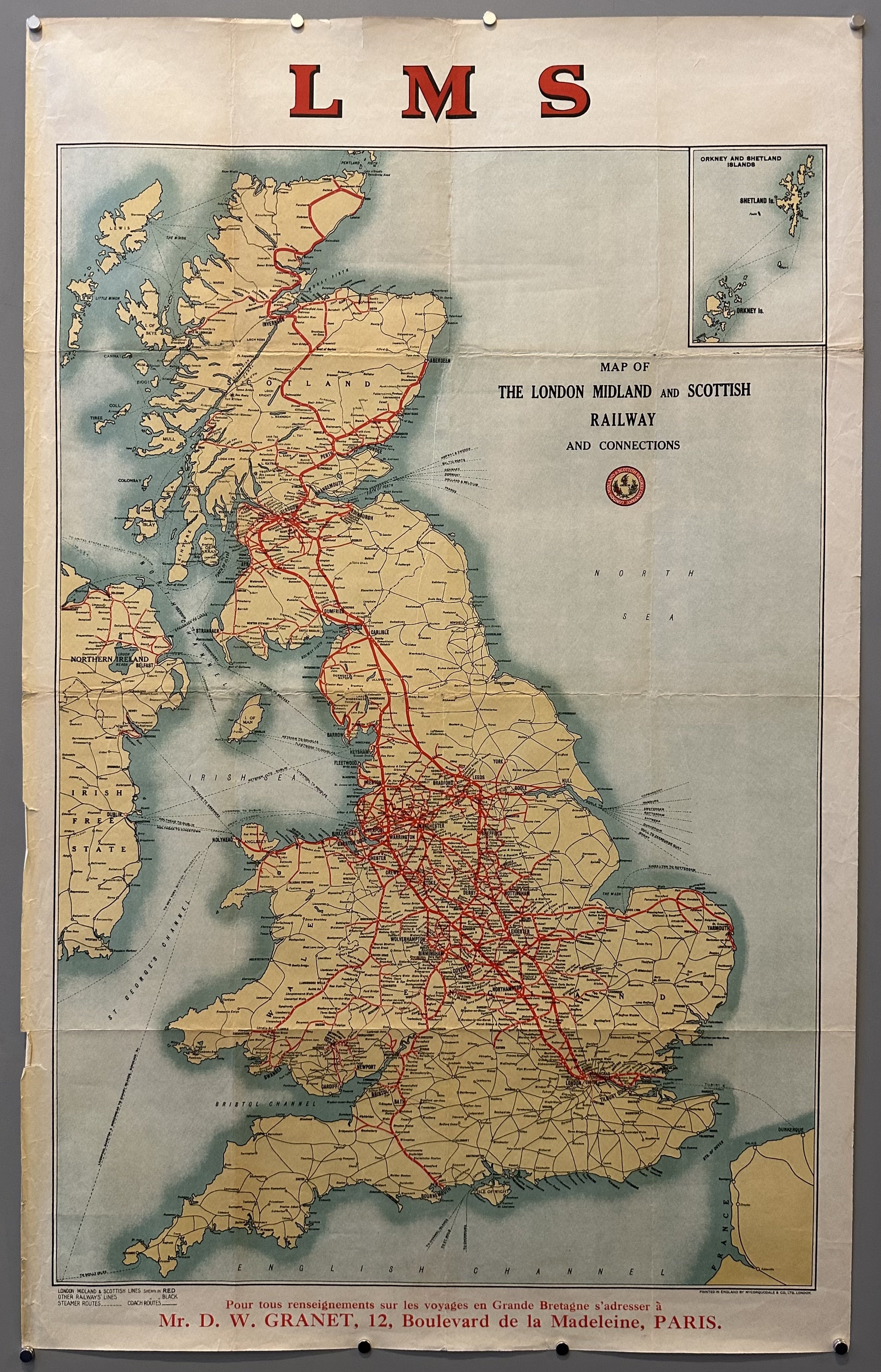 "LMS / Map of The London Midland and Scottish Railway And Connections / Pour tous renseignements sur les voyages en Grande Bretagne s'adresser à Mr. D. W. Granet"