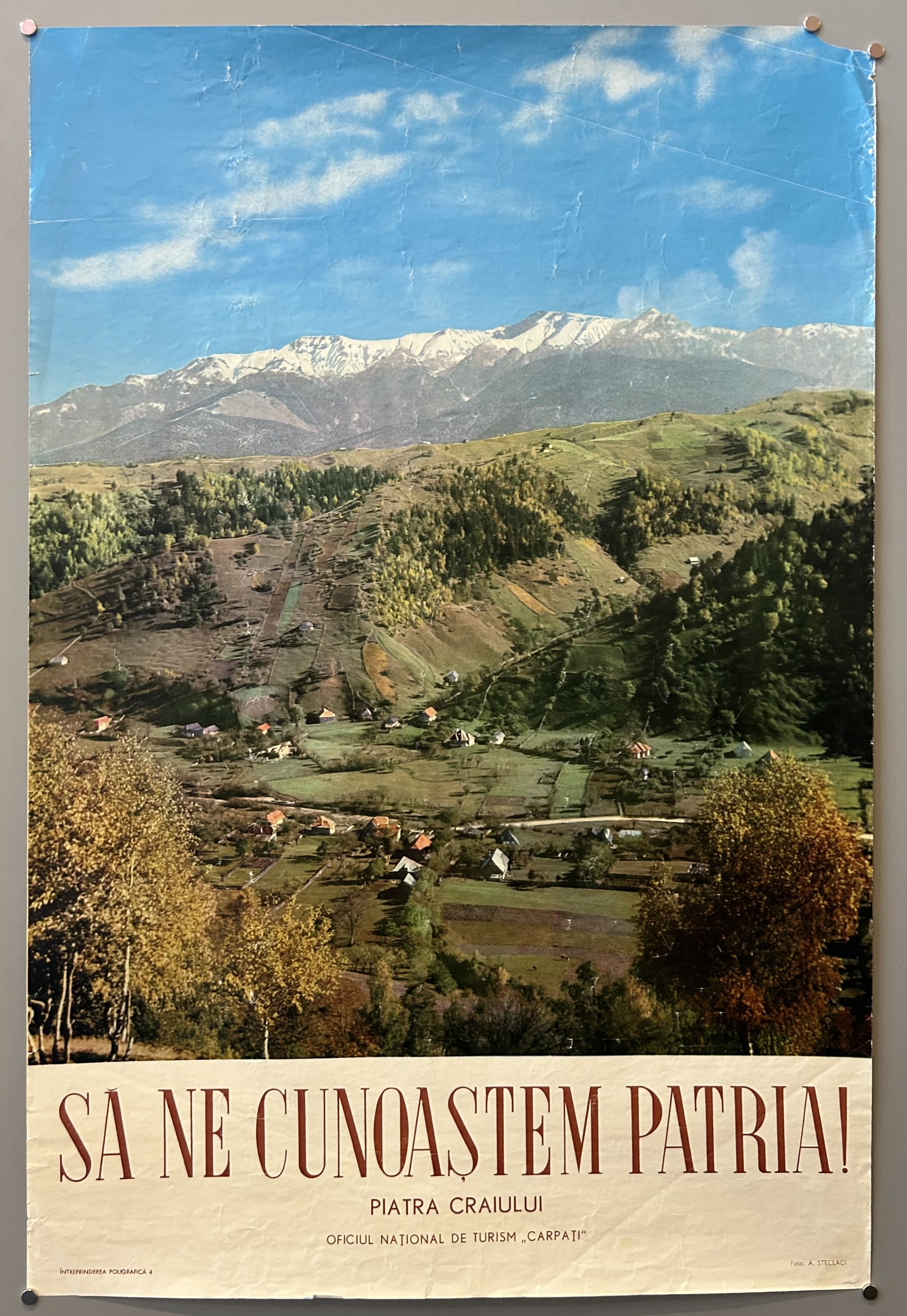 This poster, in the Romanian language, reads "Get to know our homeland!" Underneath, the poster reads Piatra Craiului, which refers to the mountain range in Romania of this name, which is shown in the photograph. The poster also includes the name of the Bucharest Carpathian National Tourism Office.