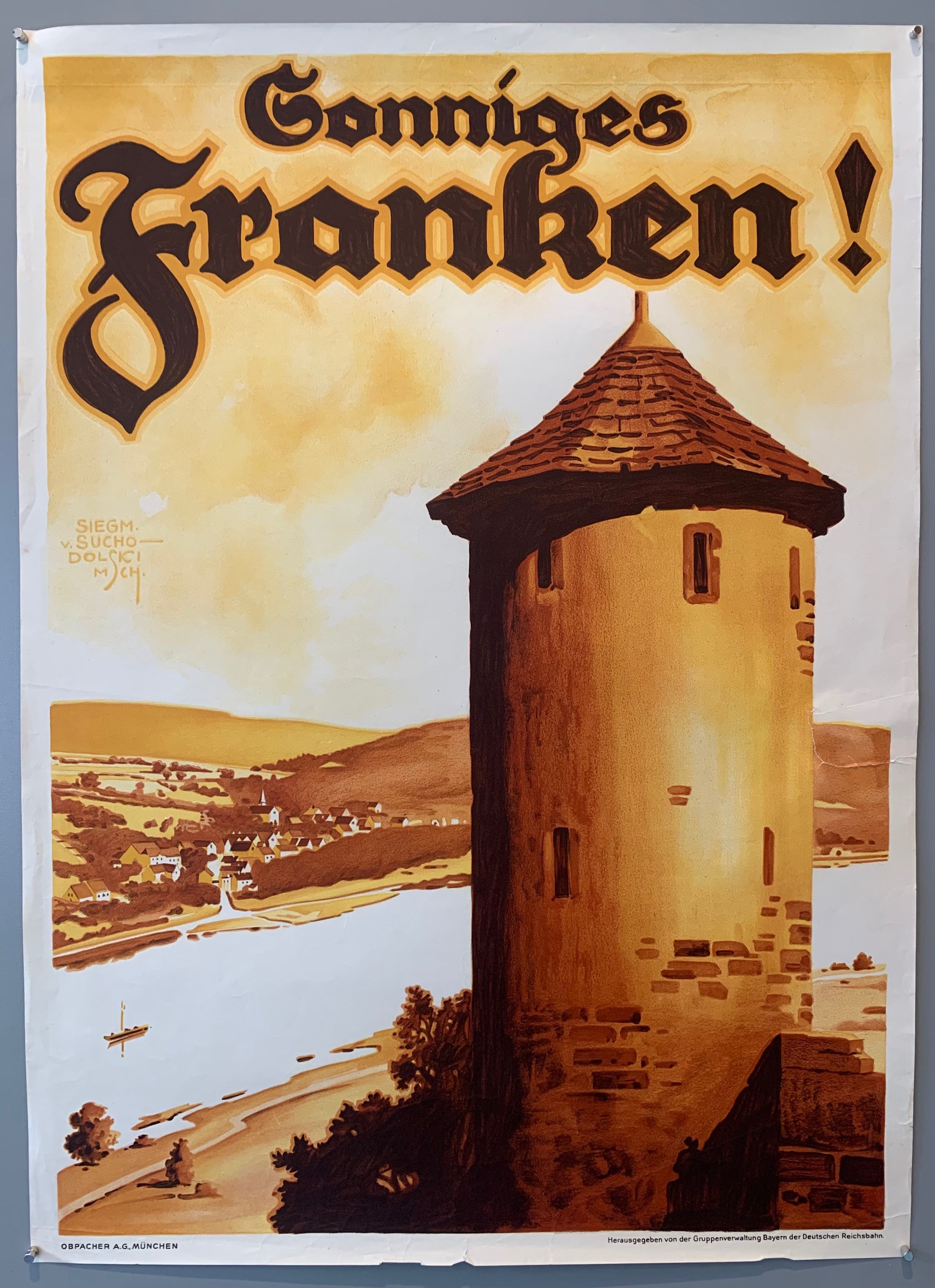 Siegmund von Suchodolski was a German painter, architect and commercial artist. He made many posters for advertisements and travel, amongst children's books and illustrating various publications. This poster shows a Franconian tower overlooking a river with a town in the background. Poster was published by the Gruppenverwaltung der Deutschen Reichsbahn. (Group administration of the Deutsche Reichsbahn)