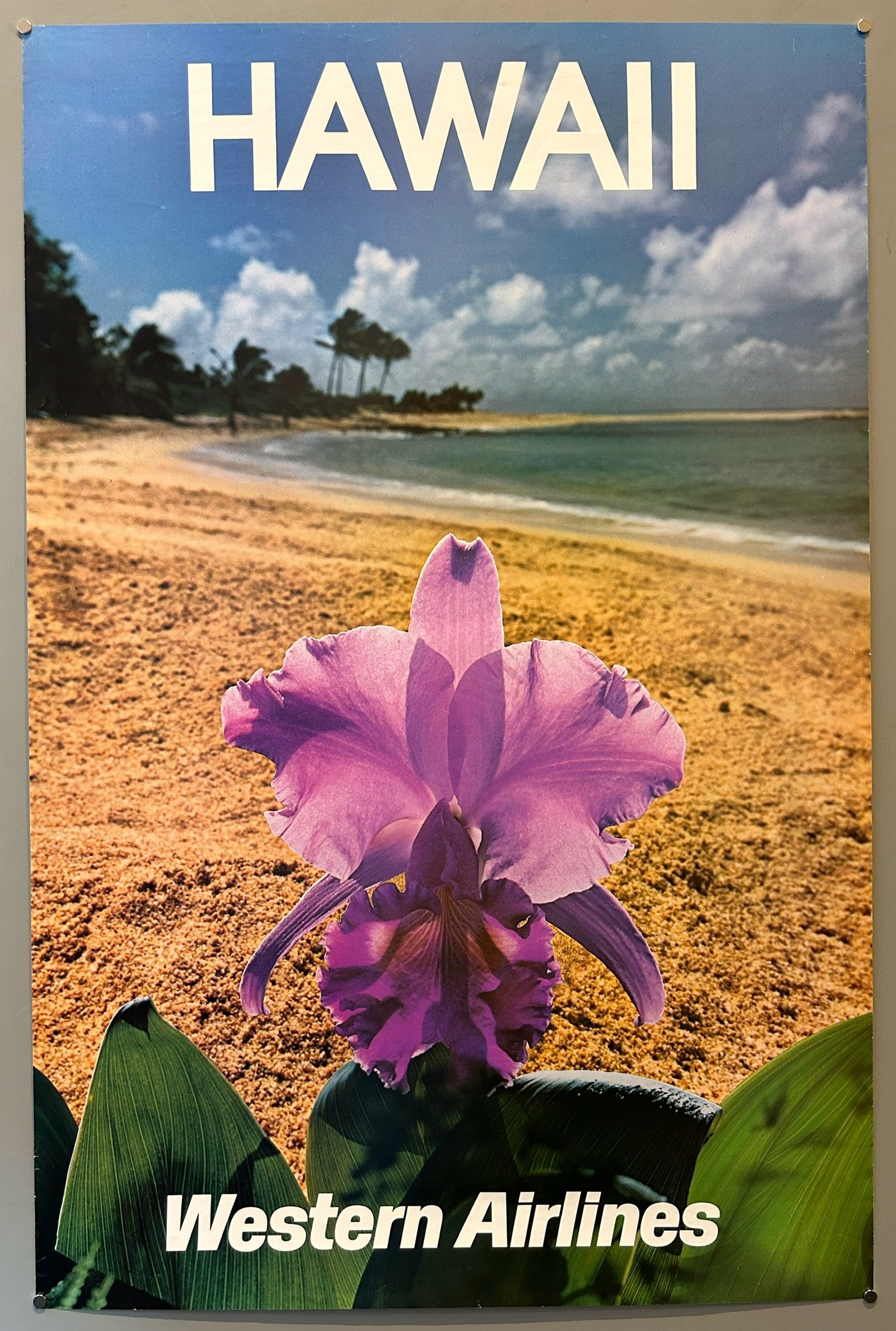 Part of a series advertising the travel available with Western Airlines, this full-color photograph depicts a purple orchid along a sandy beach, a delightfully tropical design.