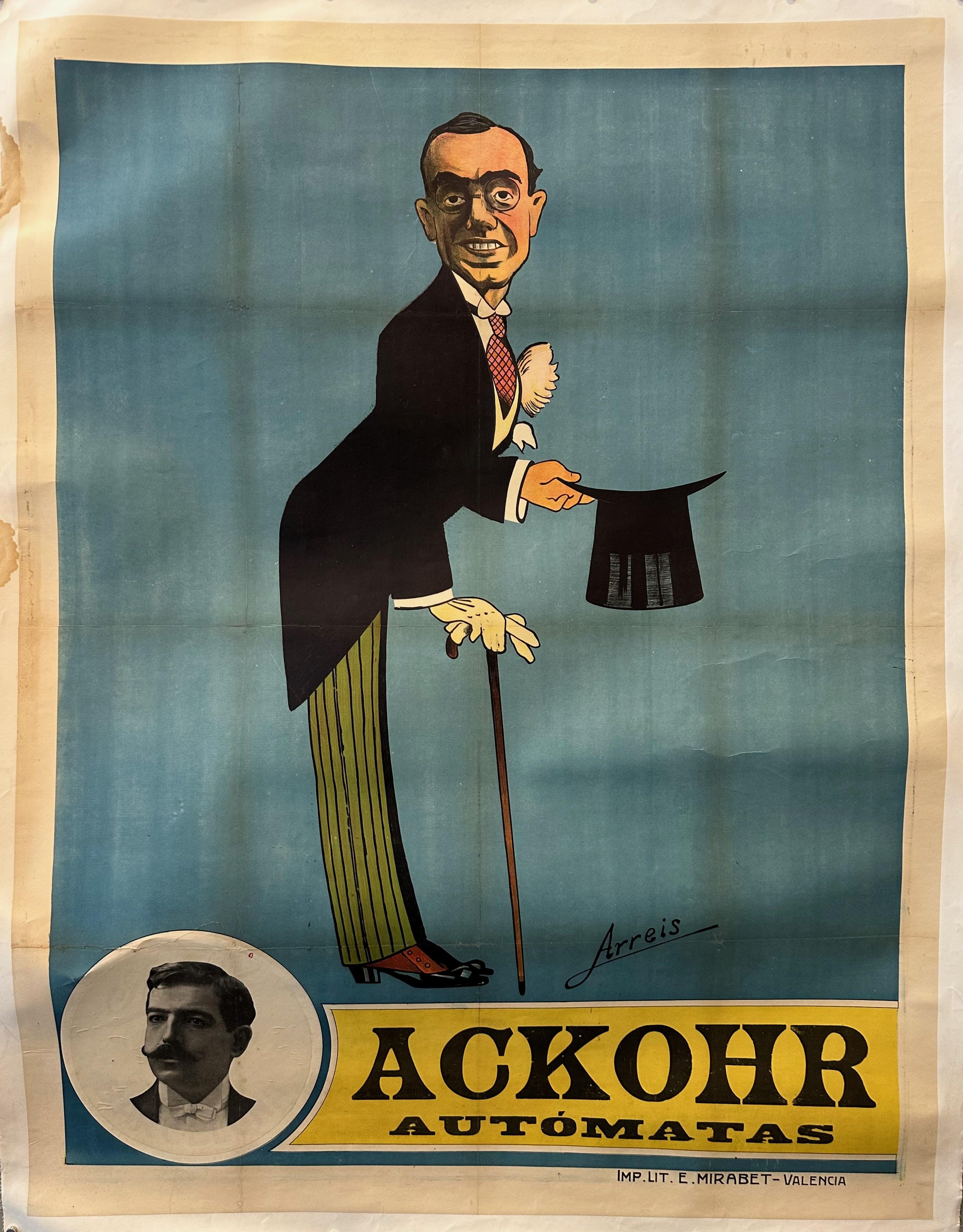 A poster featuring a formally-dressed man holding a top hat and a cane. Could be a film or automobile poster.