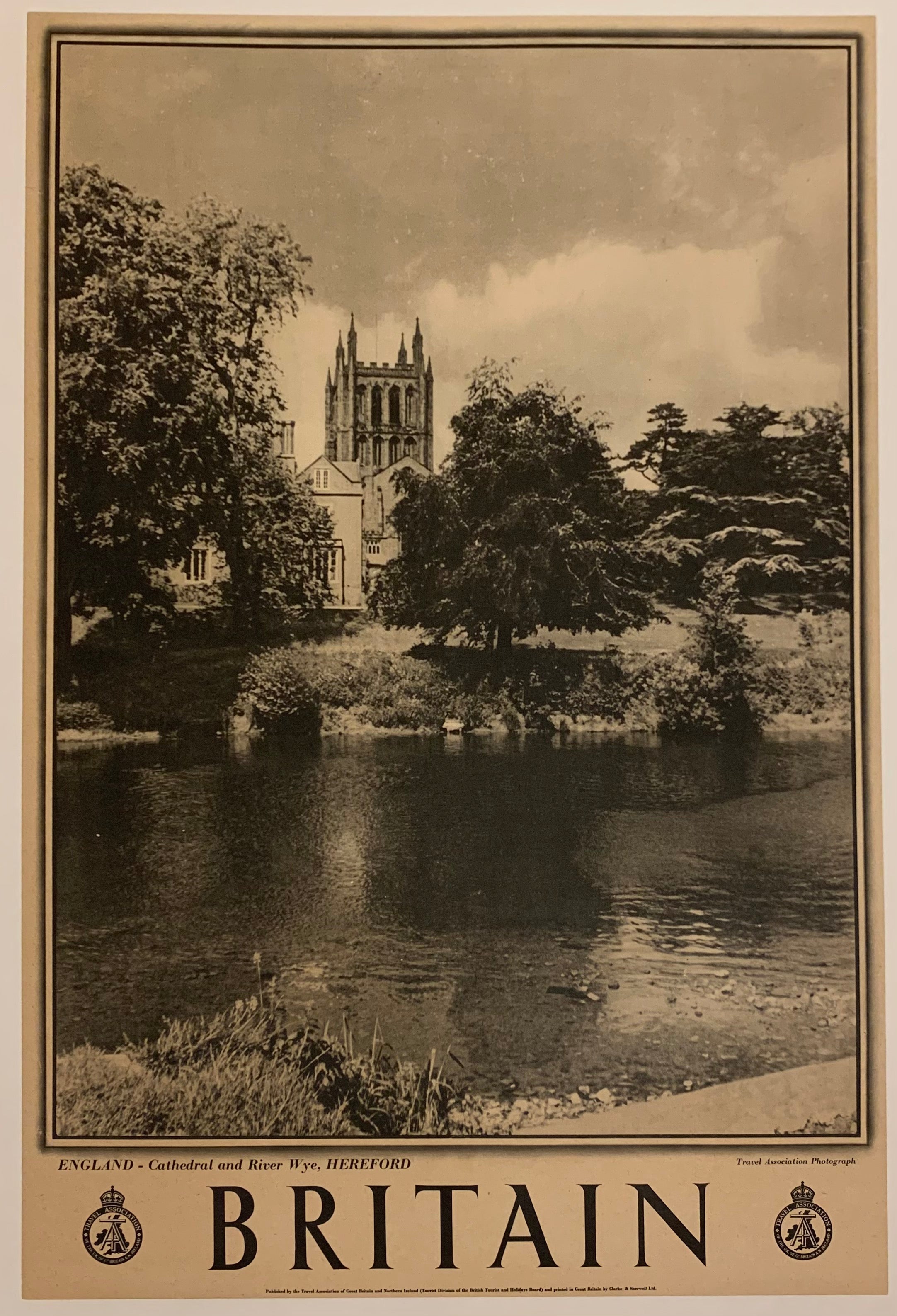 British travel poster showcasing the Hereford Cathedral and River Wye in England. The cathedral is famous not only for its beautiful architecture, but also for hosting a UNESCO World Memory Register map of the 13th century.