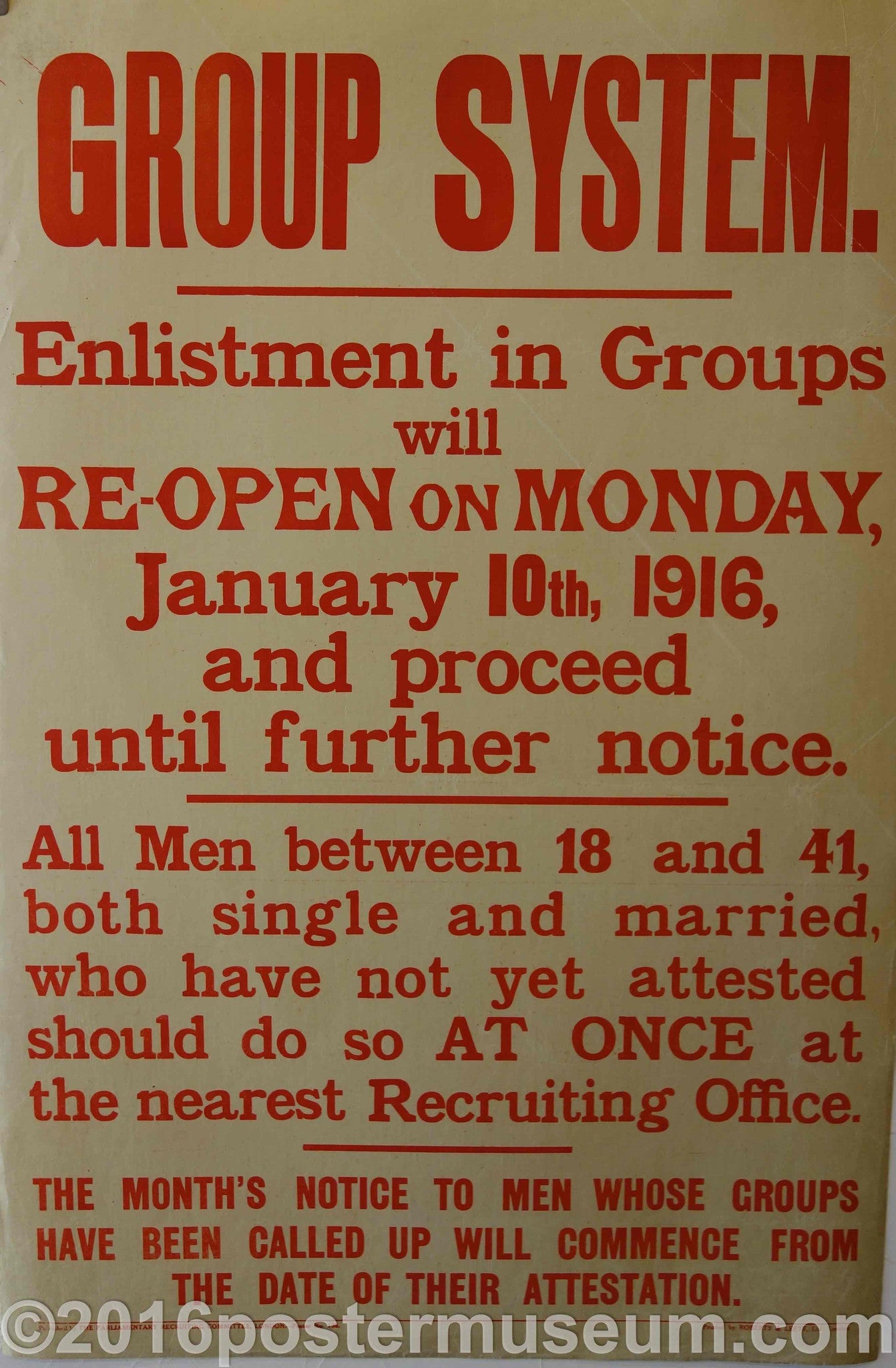 Enlistment in groups will Re-Open on Monday, Jan 10th 1916, and proceed until further notice. All men between 18 and 41, both single and married who have not yet attested should do so AT ONCe at the nearest recruiting office. The month's notice to men whose groups have been called up will commence from the date of their attestation.