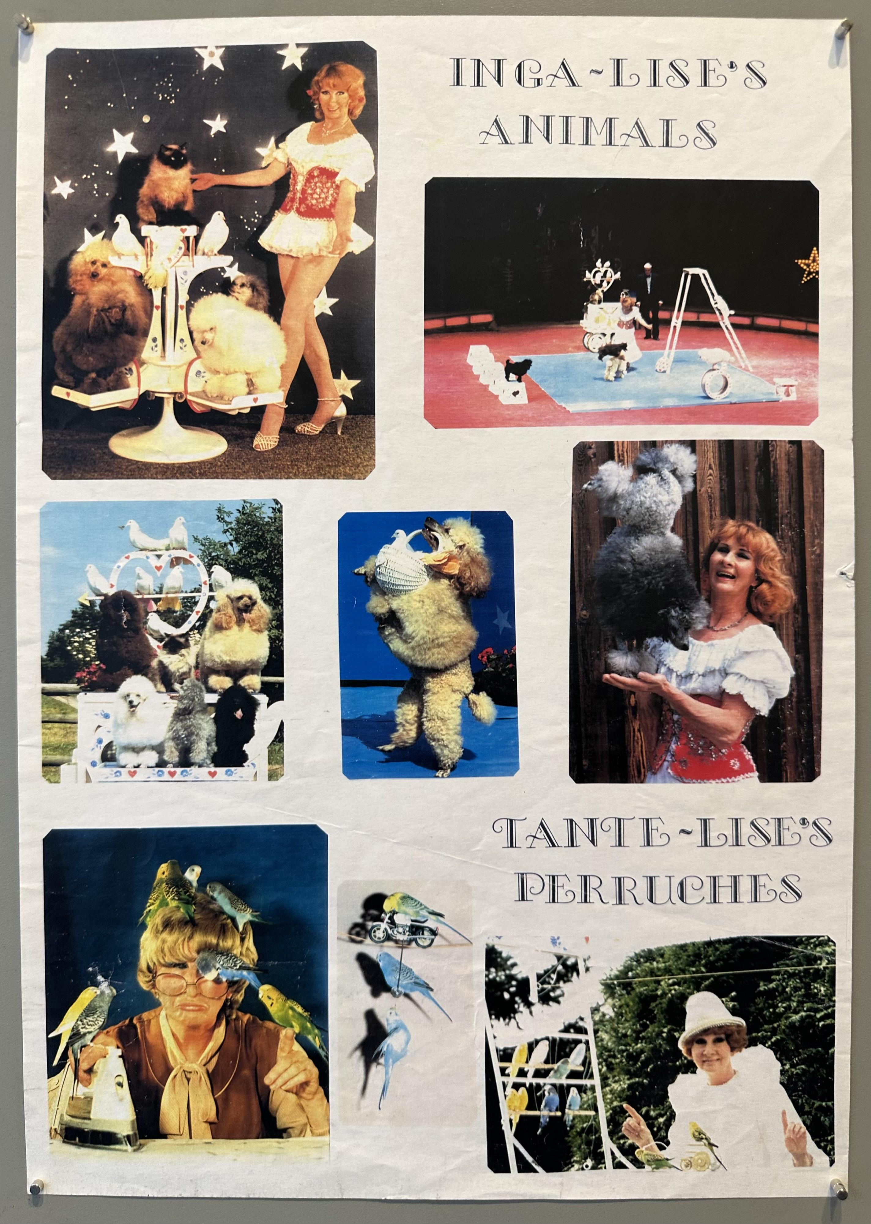 A small poster featuring trapeze artist Inga-Lise's performing poodles, parakeets, and cats.