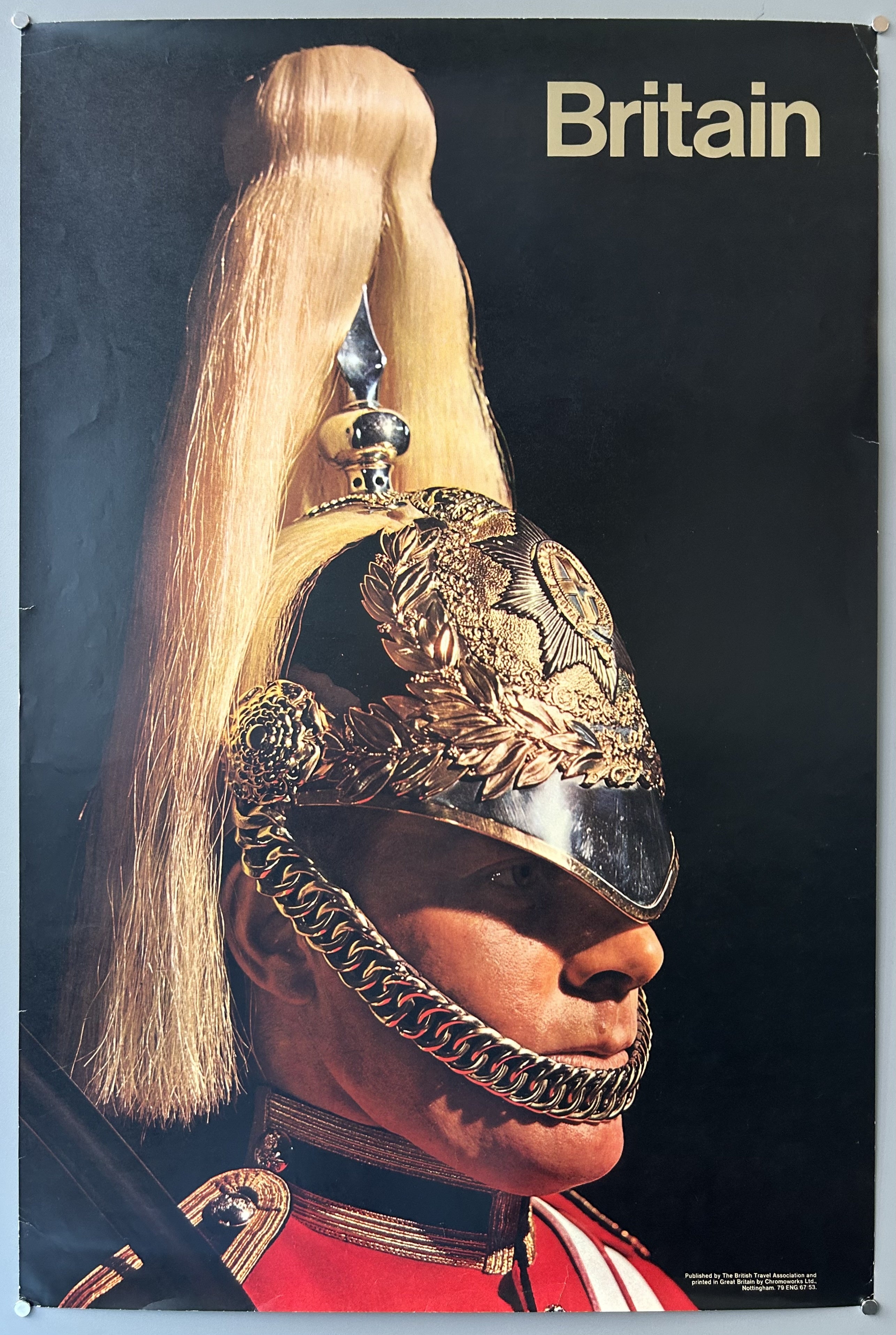 A travel poster featuring a serious portrait of a member of the British Royal Guard.