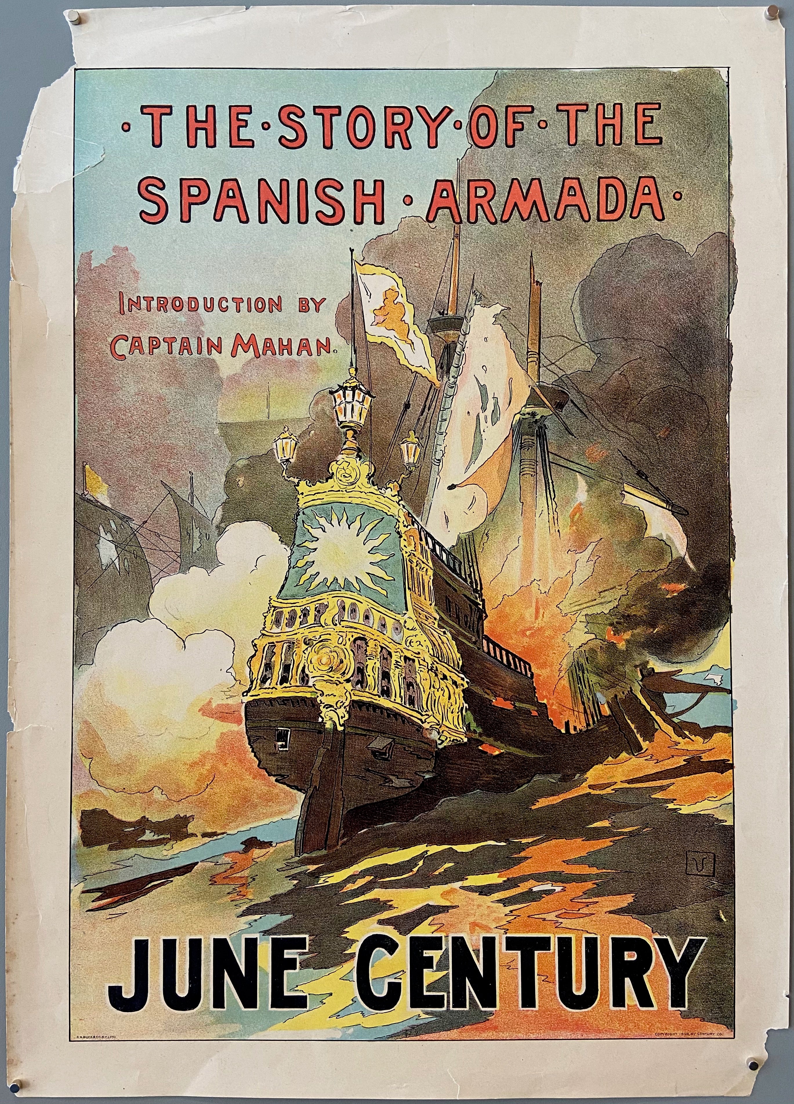 Original poster advertising a publication. This edition featured a story on a naval battle, and the fiery illustration perfectly captures the terrifying and exciting battle.