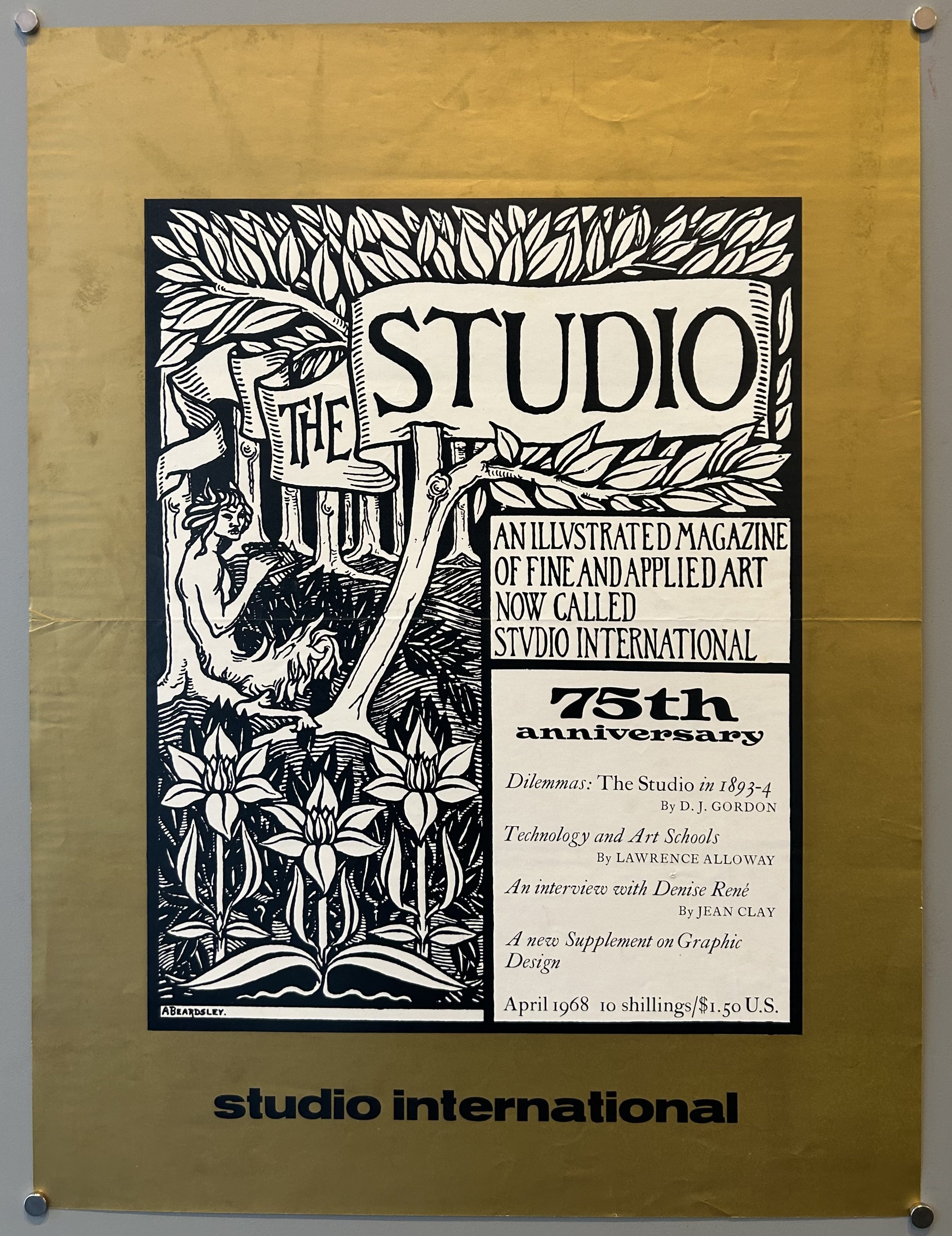 A mesmerizing gold background paired with a groovy black and white print of a centaur in a lush forest promote a magazine of arts.