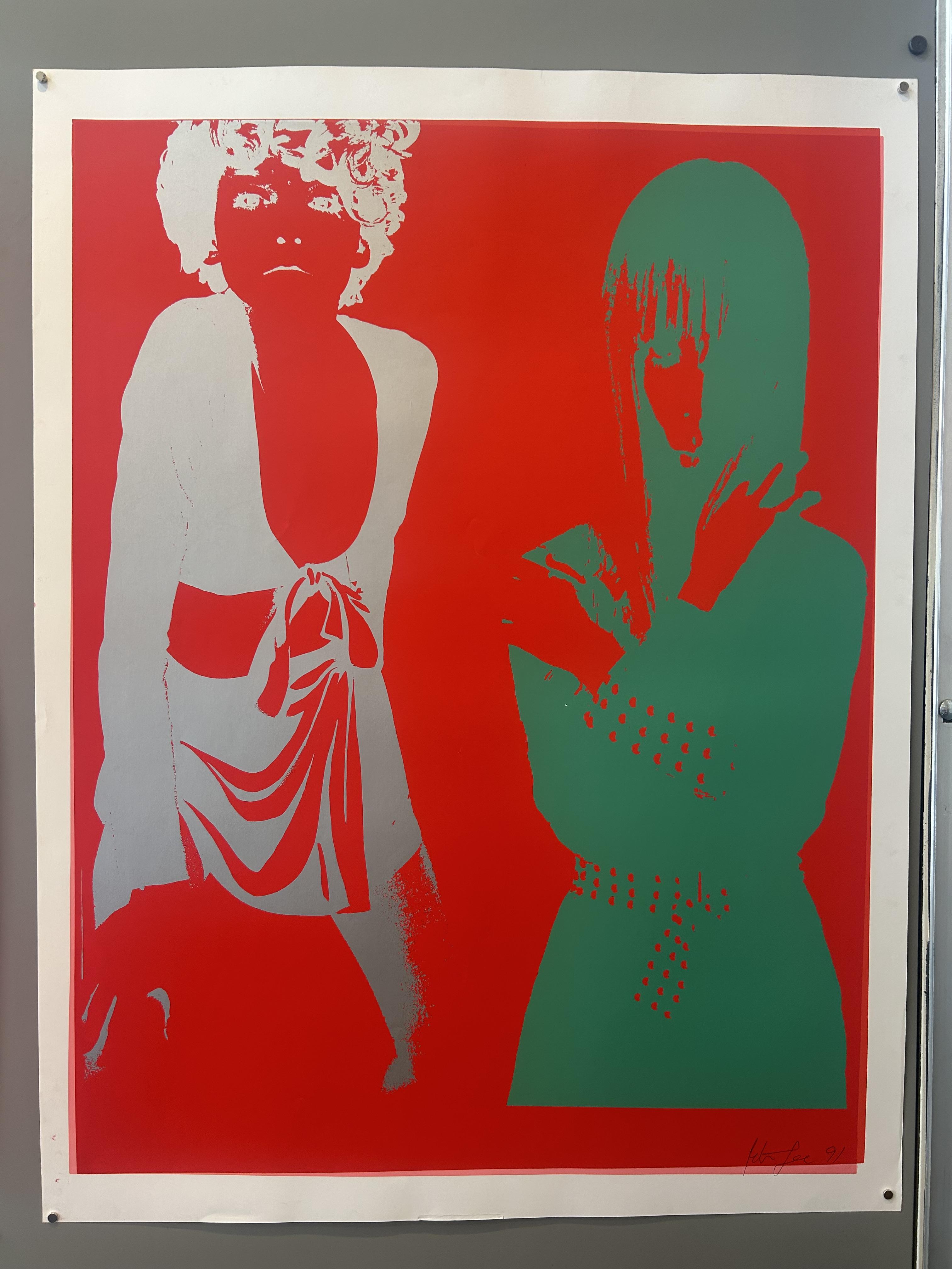 Original silkscreen print by artist Peter Gee. His use of contrasting color creates a bold and vivacious scene. Here we see two silhouttes of women side by side, specifically Betsey Johnson and Penelope Tree. The vivid neon colors of this print make it all-the-more eye-catching. Fashion designer Betsey Johnson and Peter Gee were friends as well as collaboraters. Johnson and Gee were both known for their whimsical patterns, making their works done together incredibly bright and dramatic. Along with Johnson, Penelope Tree also modeled in these, and other prints of Gee's. Not only was this print series important in the pop art era, but the outlined figures filled with movement clearly had an influence over the colorful Apple iPod silhouette posters from the 2000s.