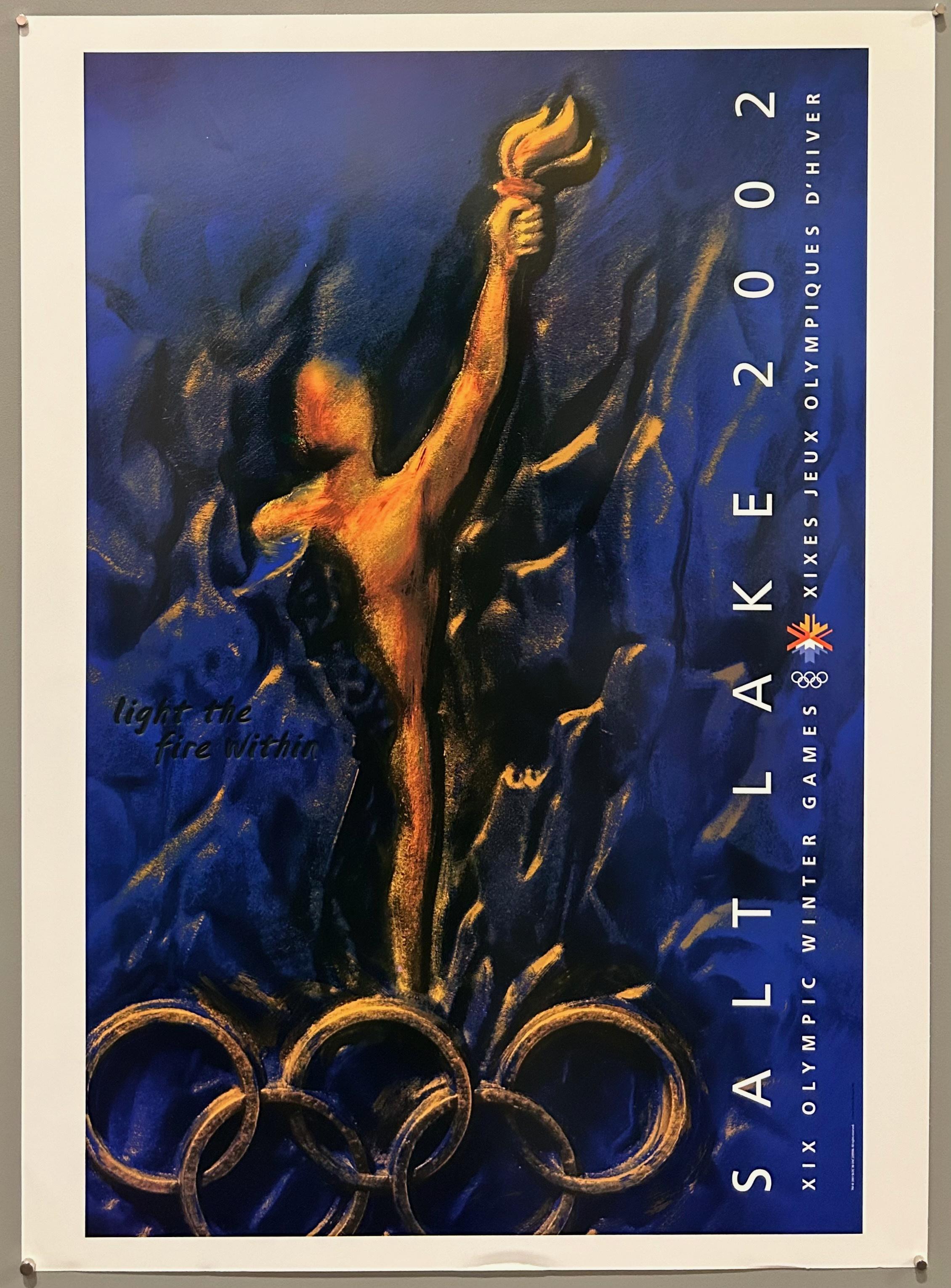 A reprint of the original poster from the 2002 Salt Lake City Olympic Games featuring a figure holding the Olympic torch on top of the rings.