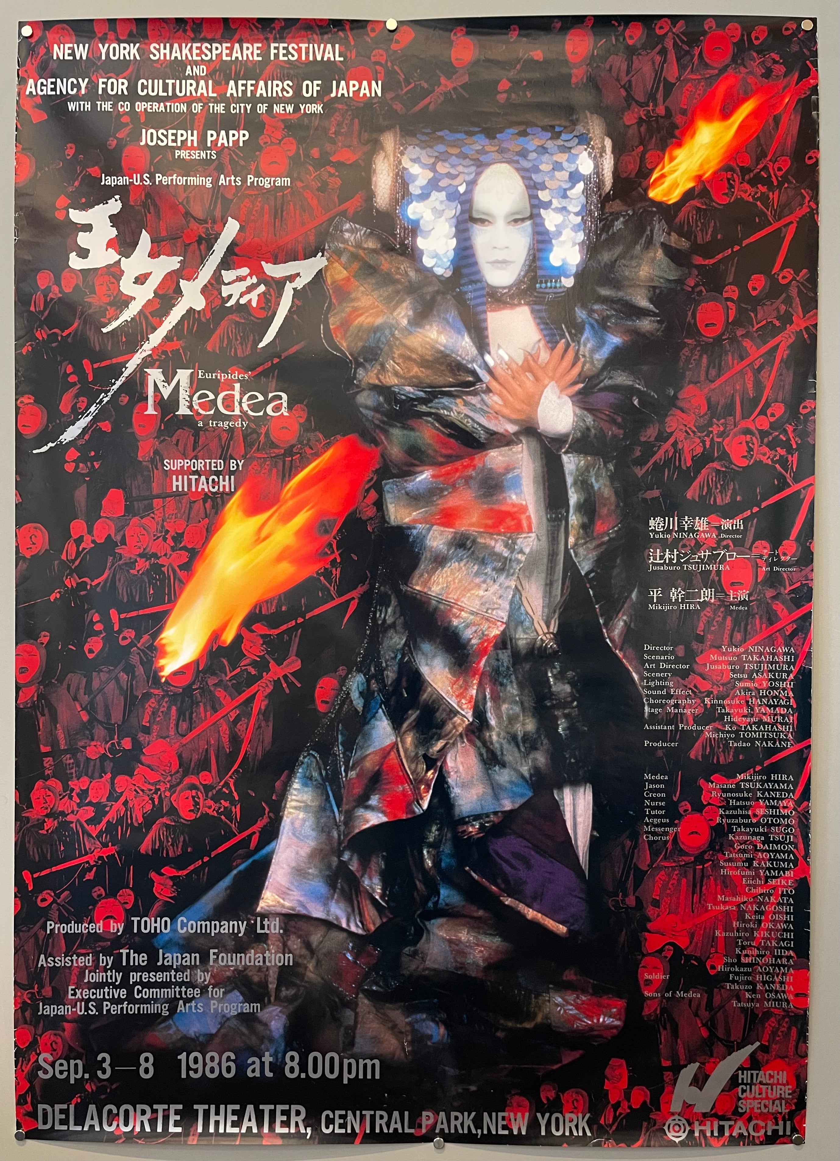 "New York Shakespeare Festival and Agency for Cultural Affairs of Japan with the Cooperation of the City of New York. Joseph Papp Presents Japan-U.S. Performing Arts Program. A tragedy Supported by Hitachi. Produced by TOHO Company Ltd. Assisted by The Japan Foundation. Jointly presented by Executive committee for Japan-U.S. Performing Arts Program. Delacorte Theater, Central Park, New York."
