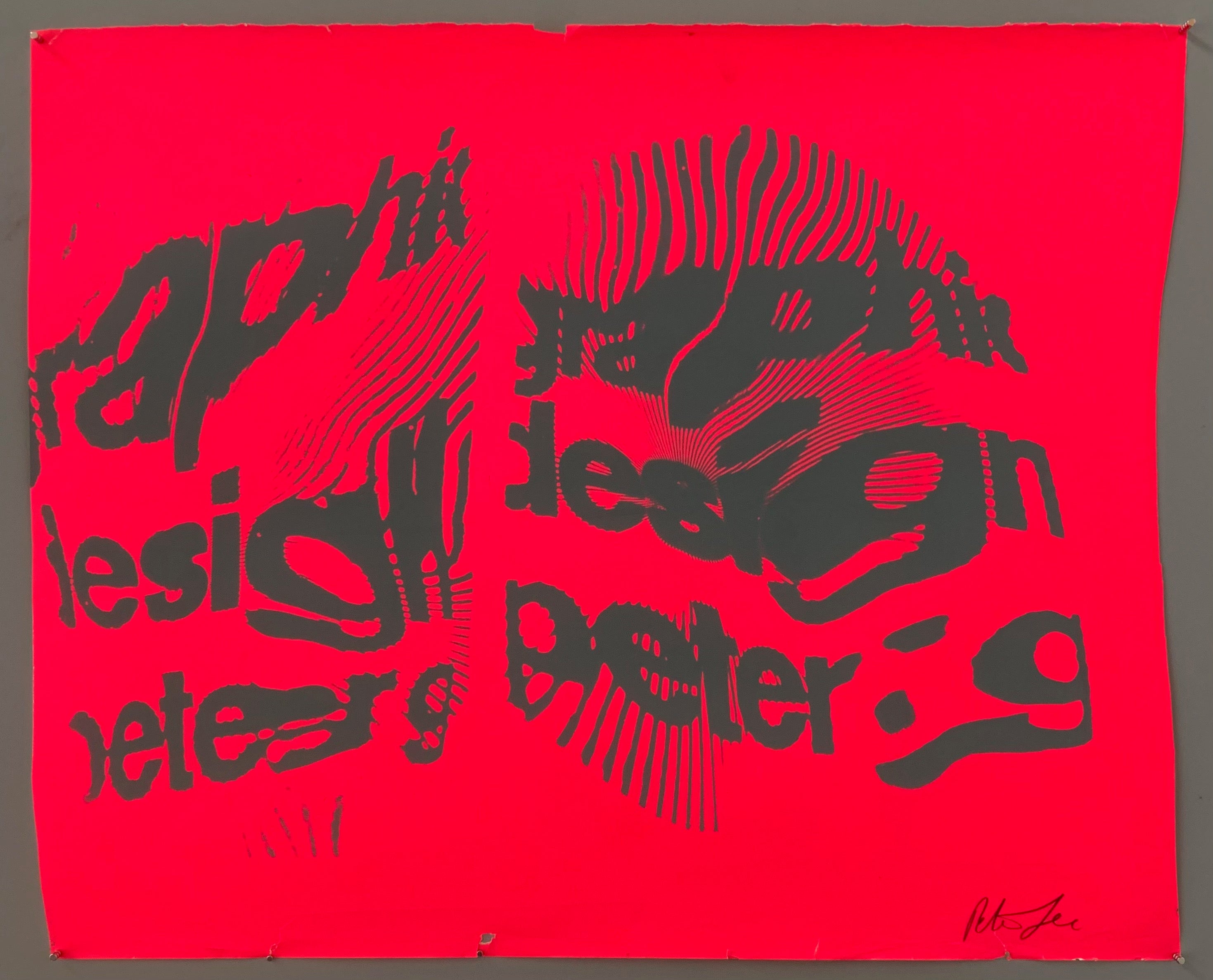 Original silkscreen print by artist Peter Gee showing a psychedelic logo for his design studio. The words are distorted by what looks like two fingerprints. The bright orange-hued pink and grey make this all the more eye-catching. This play on his last name, writing G instead of Gee, was used in many of his designs, though his signature, found at the bottom right, says "Gee."
