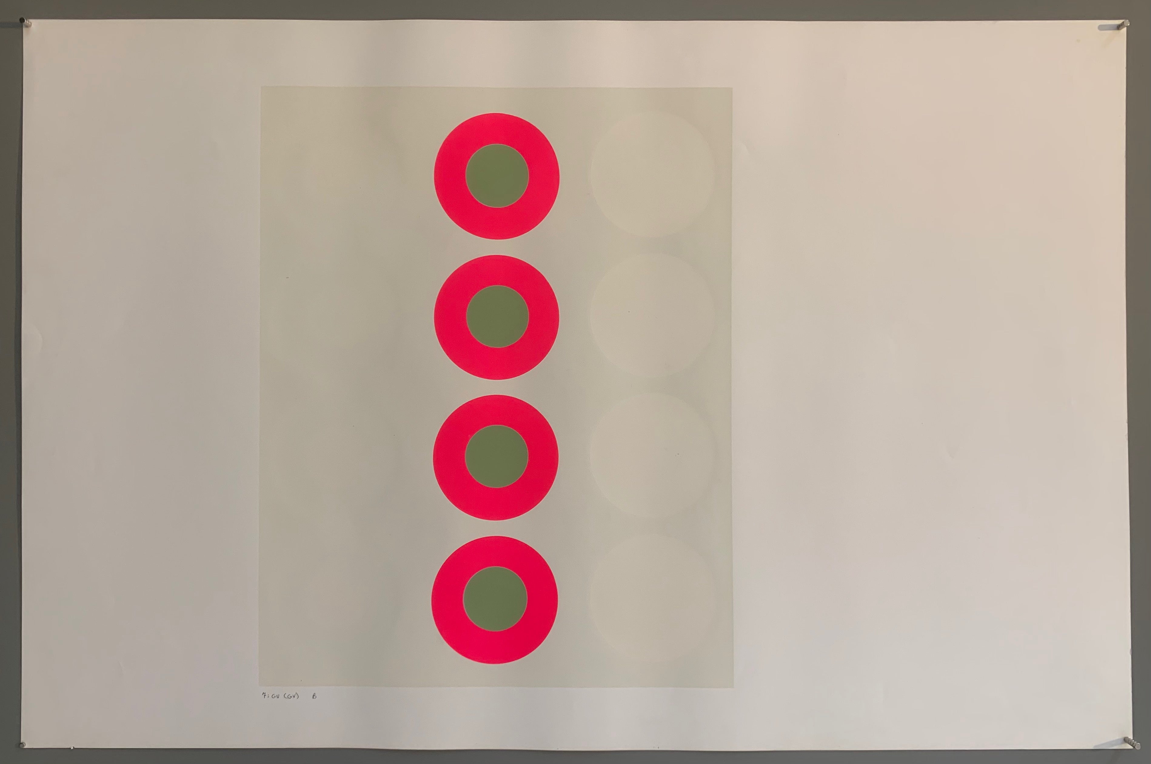Original silkscreen print by artist Peter Gee showing a rectangle made by three panels each holding a line of targets. The targets are hued in the lightest of creams, except for pops of neon pink and green, creating a lovely combination.