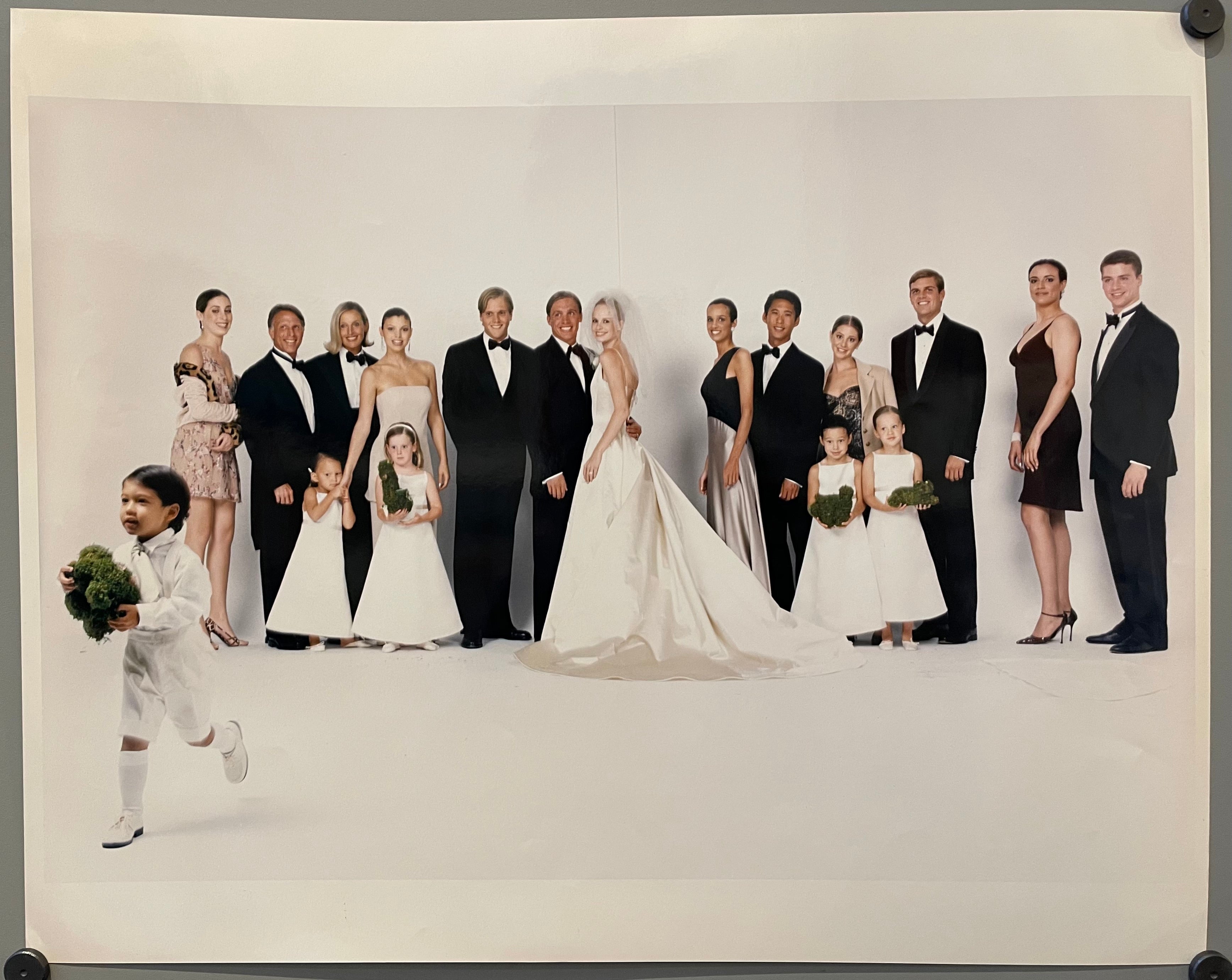 Original photograph of a bride, groom, and their various best men and women. The shot of one of the flower boys running out the frame adds a touch of humour to an otherwise formal scene.