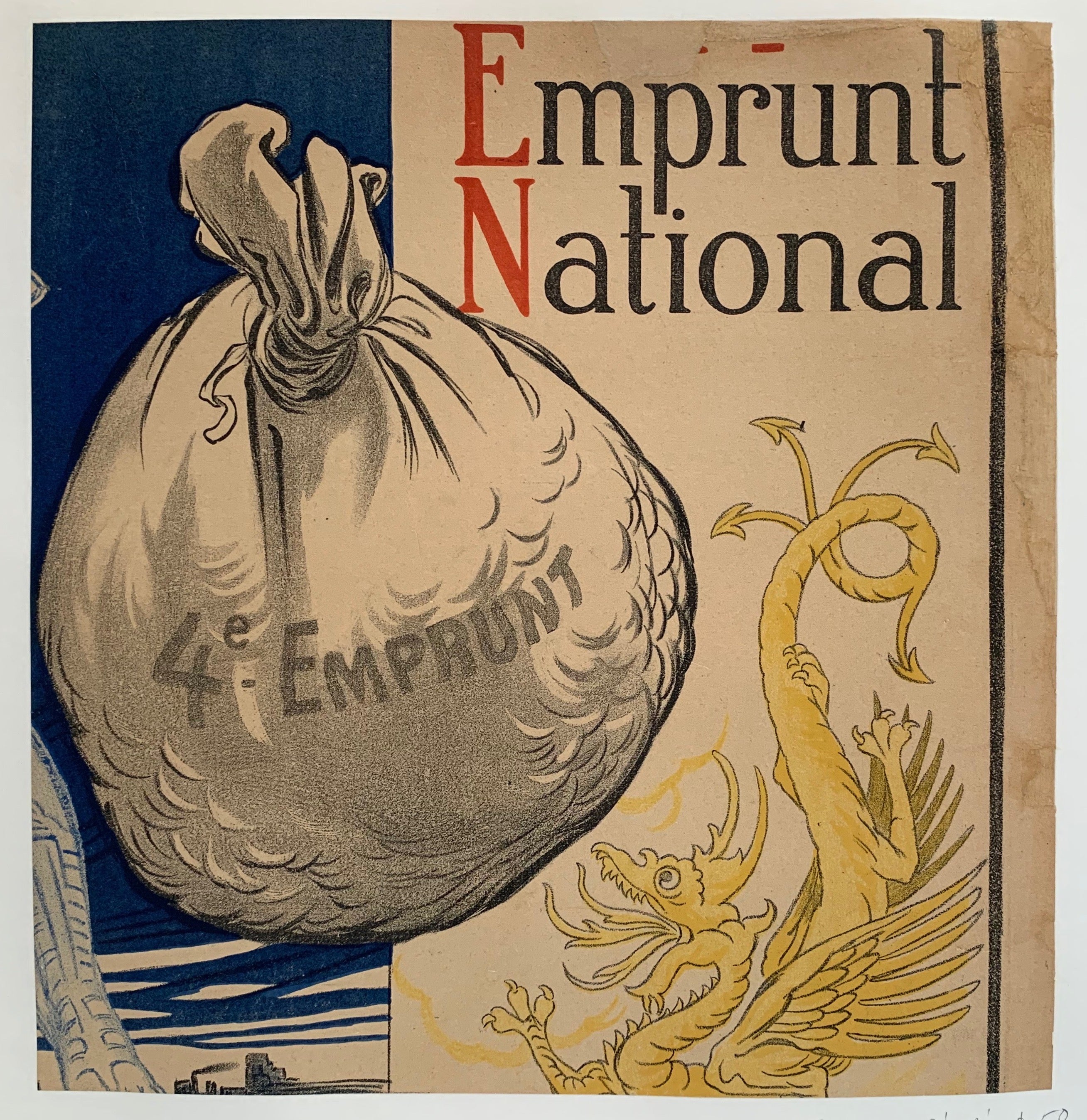 This is part of a much larger poster whose full title is "Banque Industrielle de Chine. 74, Rue St. Lazare Paris." It is showing a giant bag of money, asking citizens to take out war bonds to support World War I efforts.