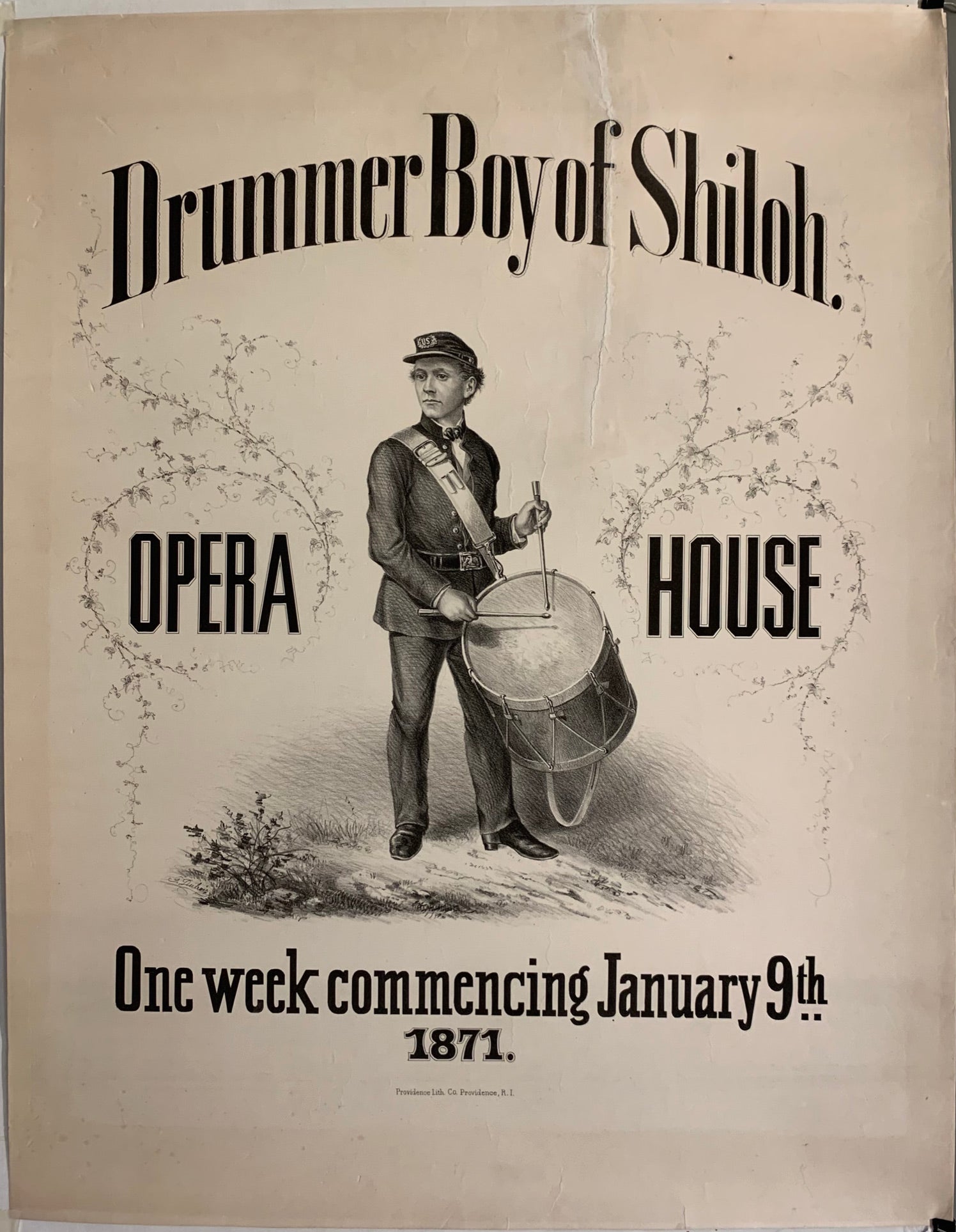Vintage poster for the play Drummer Boy of Shiloh, one of the most widely produced pieces of theater of the 19th Century. The poster features a detailed black and white sketch of the Civil War's favorite drummer boy.
