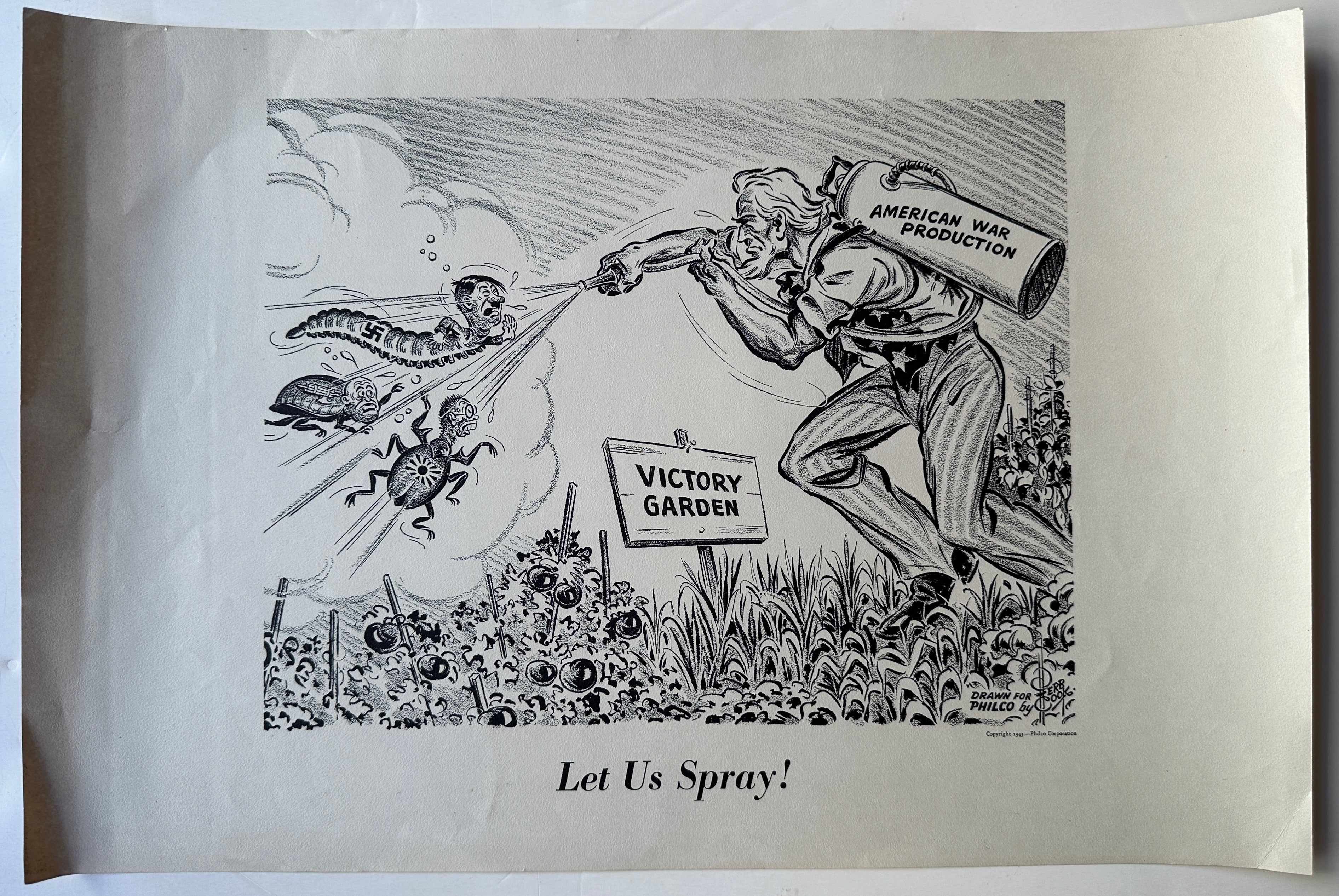 This satirical cartoon depicts Uncle Sam spraying insecticide, or, 'American War Production' onto insect personifications of Hitler, Mussolini, and Tojo. Philco was a pioneer in battery, radio, and television production.