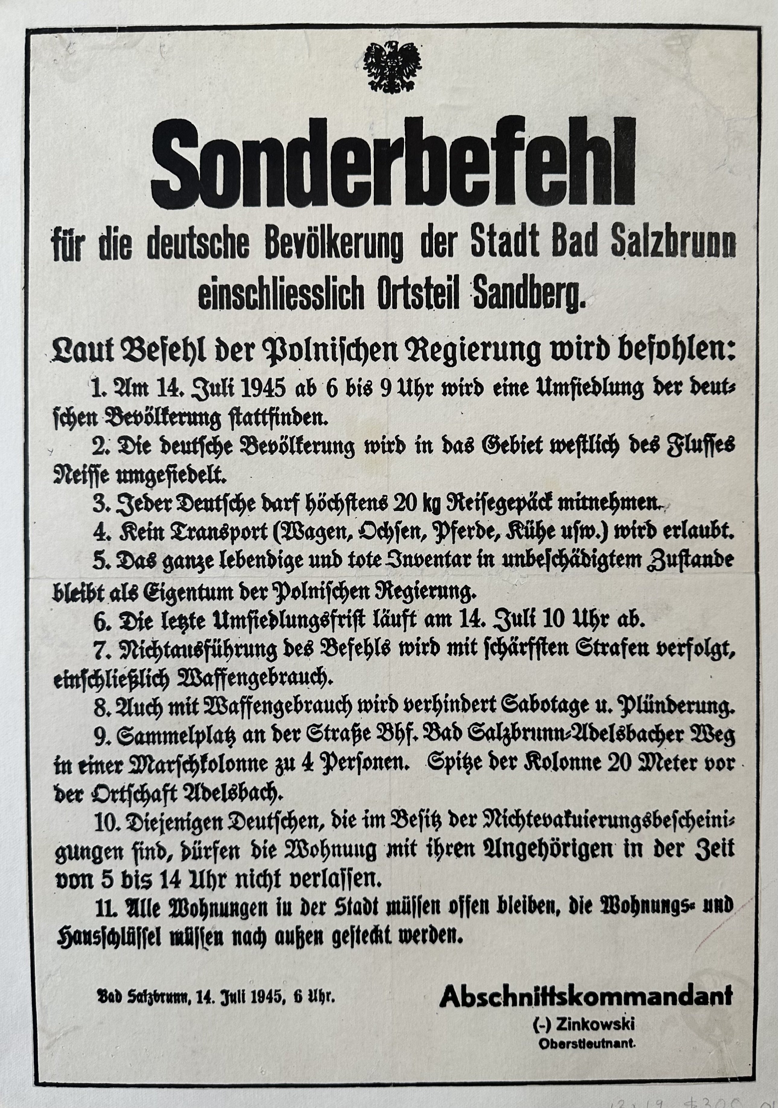 "Sonderbefehl fûr die deutsche Bevölkerung der Stadt Bad Salzbrunn einschliesslich Ortsteil Sandberg / Laut Befehl der Polnischen Regierung wird befohlen: 1. Am 14. Juli 1945 ab 6 bis 9 Uhr wird eine Umsiedlung der deuts schen Bevölkerung stattfinden. / 2. Die deutsche Bevölkerung wird in das Gebiet westlich des Flusses Neisse umgesiedelt."