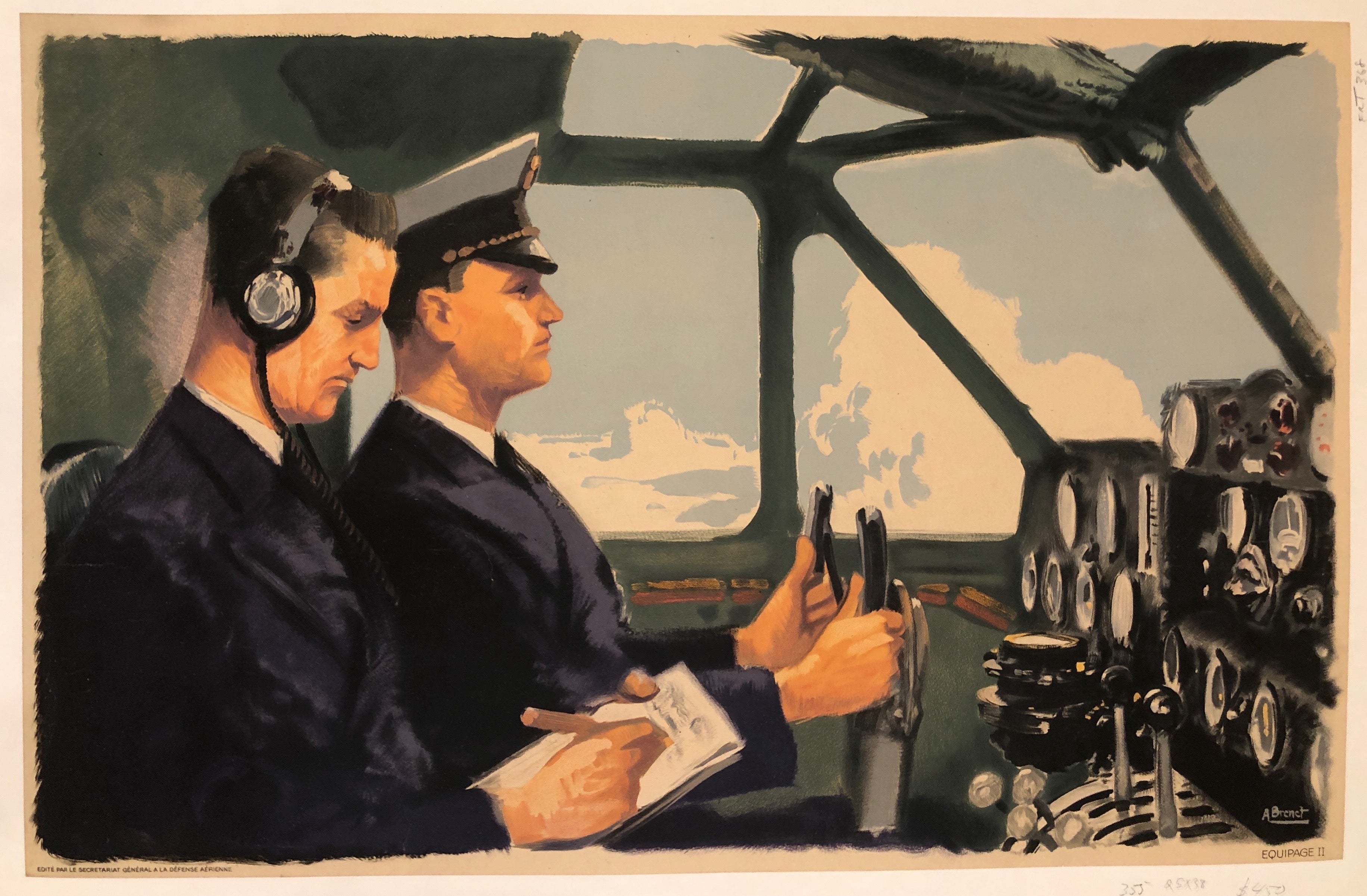 Vintage French poster showing a wonderfully detailed painting of a pilot and co-pilot in the cockpit. A sneak peek into the finer details of flight usually hidden from the passengers.