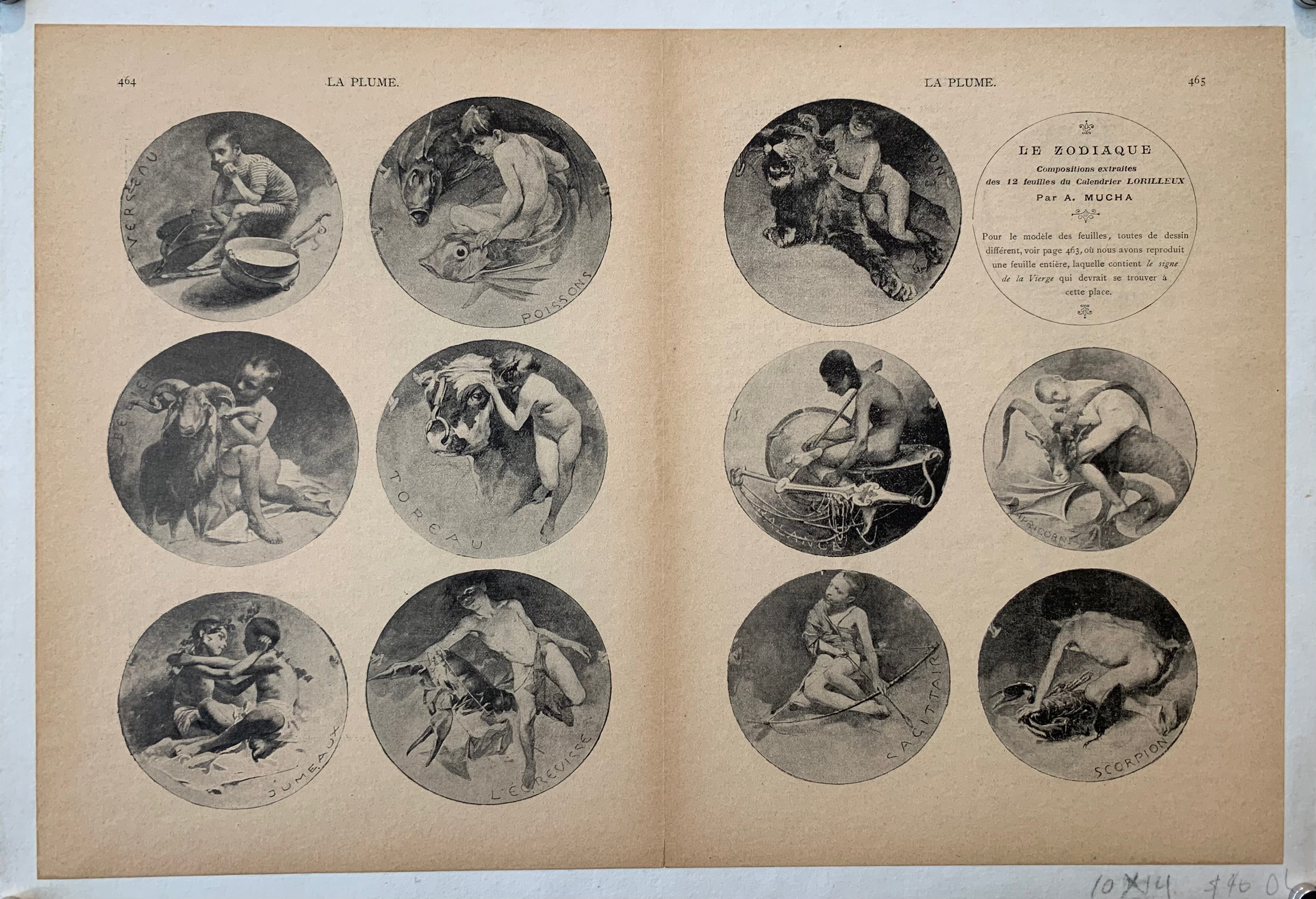 This piece was originally a centerfold spotlight in La Plume, a French bi-monthly literary and artistic review. The magazine was established in 1889 and ran until 1914. Famous artists such as Grasset, Toulouse-Latrec, Pissarro, Signac, and Seurat all contributed to its artistry. In the circular images, the twelve zodiac signs are drawn.