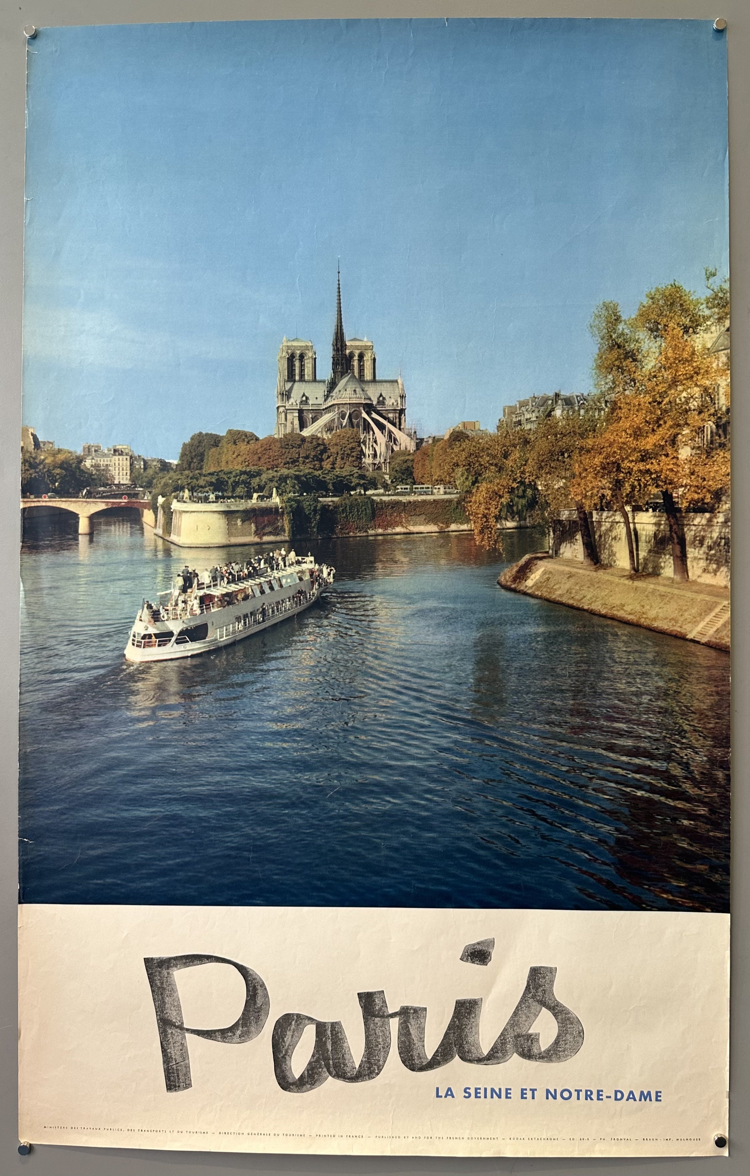 This is promoting tourists to come visit the Notre-dame Cathedral. The image captures a sightseeing boat on river seine going towards the Cathedral on the Île de la Cité (City Island). The
