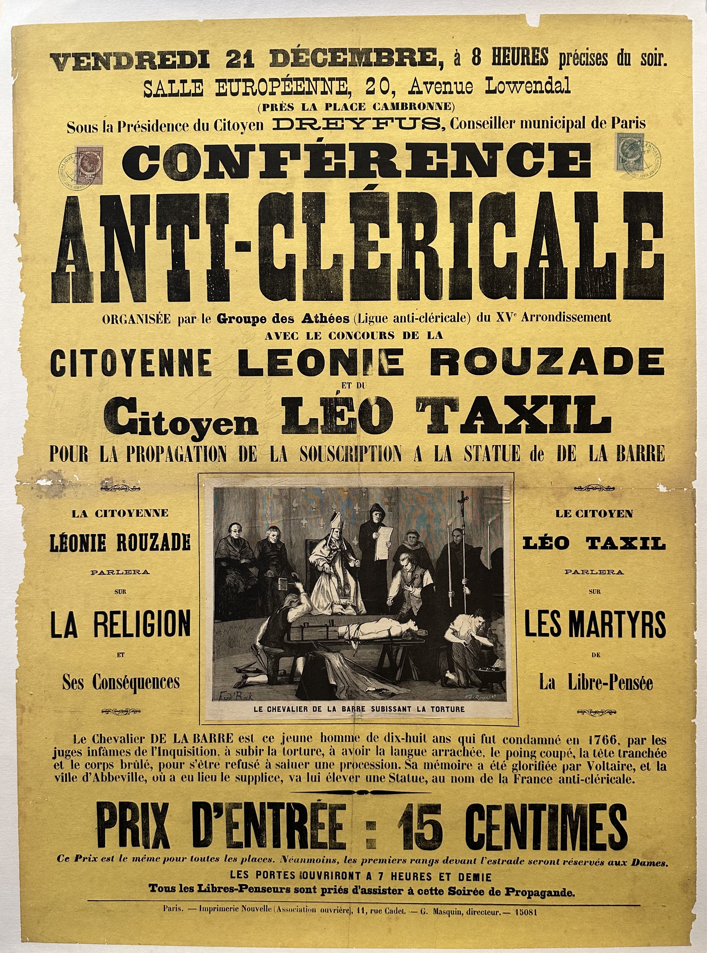 Translation: The chevalier de la barre undergoing torture - The Chevalier DE LA BARRE is this young man of eighteen years who was condemned in 1766, by the infamous judges of the Inquisition, to undergo torture, to have his tongue torn out, his fist cut off, his head cut off and his body burned, for having refused to salute a procession. His memory was glorified by Voltaire, and the city of Abbeville, where the torture took place, will erect a Statue to him, in the name of anti-clerical France.