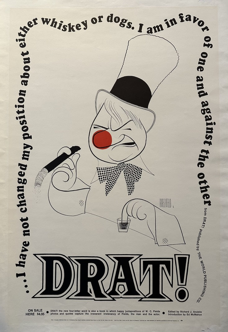 Fields has a top hat and clown nose while smoking a cigar and dipping his finger in a drink.