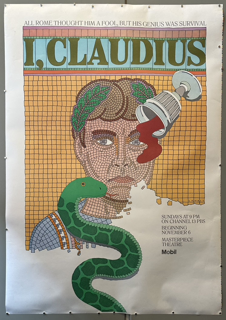 Promotes the acclaimed 1976 BBC television adaptation of Robert Graves' novels I, Claudius and Claudius the God, which aired on PBS in the United States.
