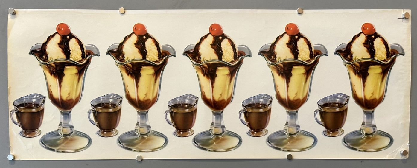 This poster features five identical images of a hot fudge sundaes. The poster is a vintage advertisement from the 1950s, designed to promote soda fountains or ice cream parlors