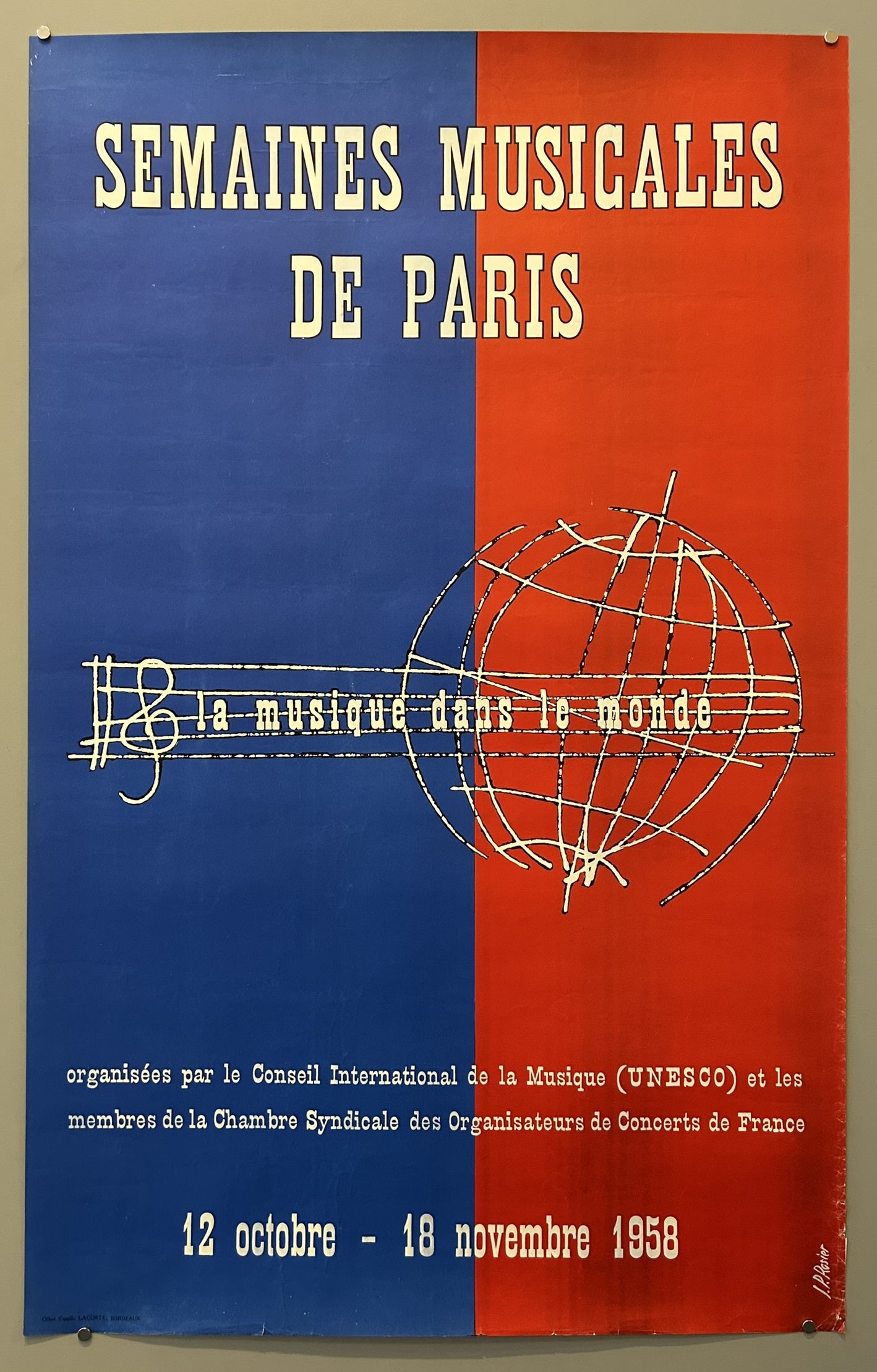 Translation:"PARIS MUSIC WEEKS Music around the world/ organized by the International Music Council (UNESCO) and members of the Chambre Syndicale des Organisateurs de Concerts de France/ October 12 - November 18, 1958