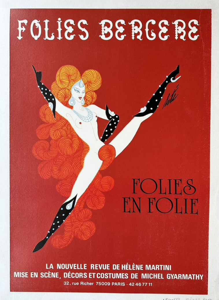 English Translation: "Folies Bergère / Folies En Folie / The New Revue by Helene Martini / Staging, Sets and Costumes by Miches Gyarmarthy".