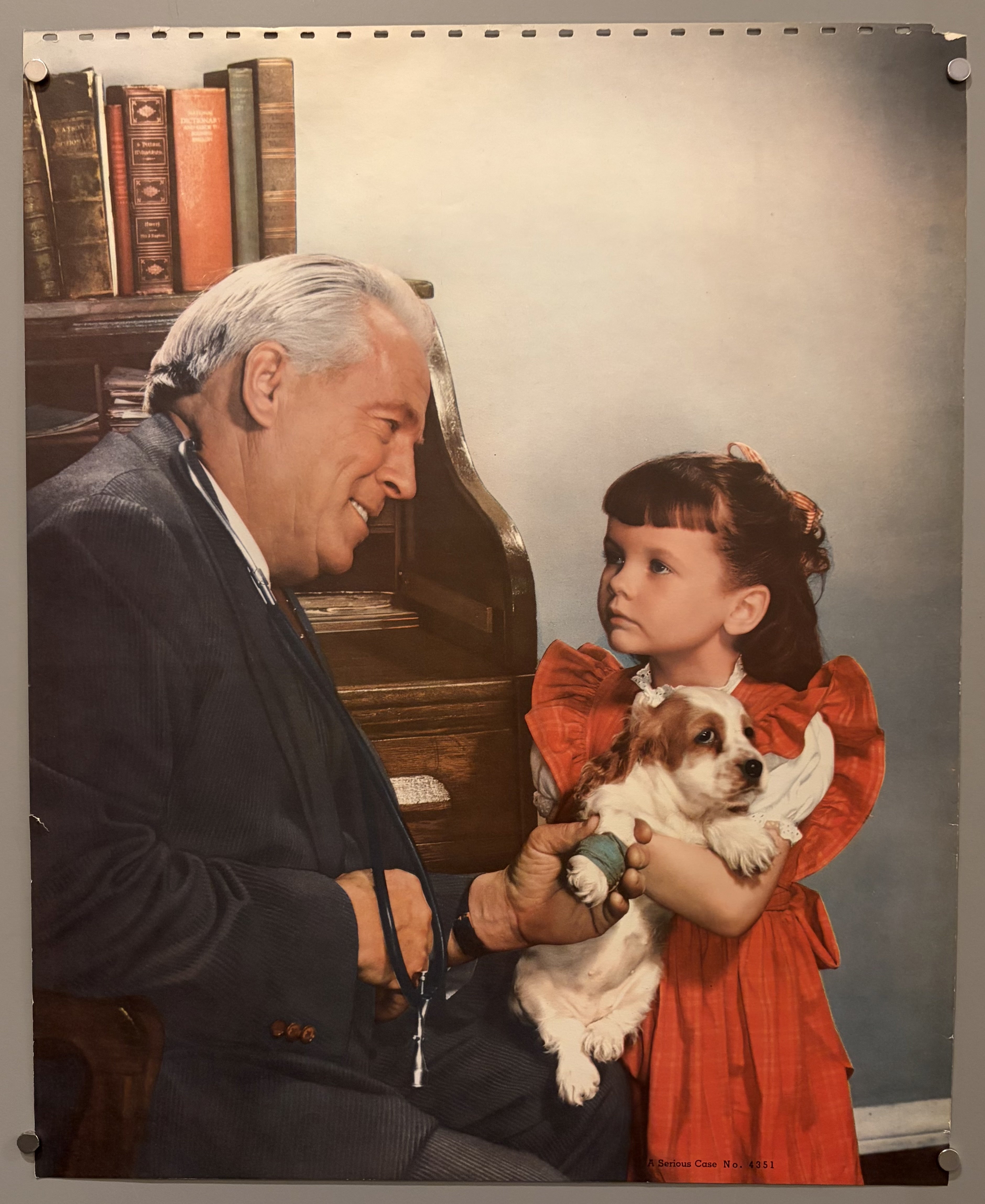 A vintage print depicting a young girl and her dog visiting a veterinarian.