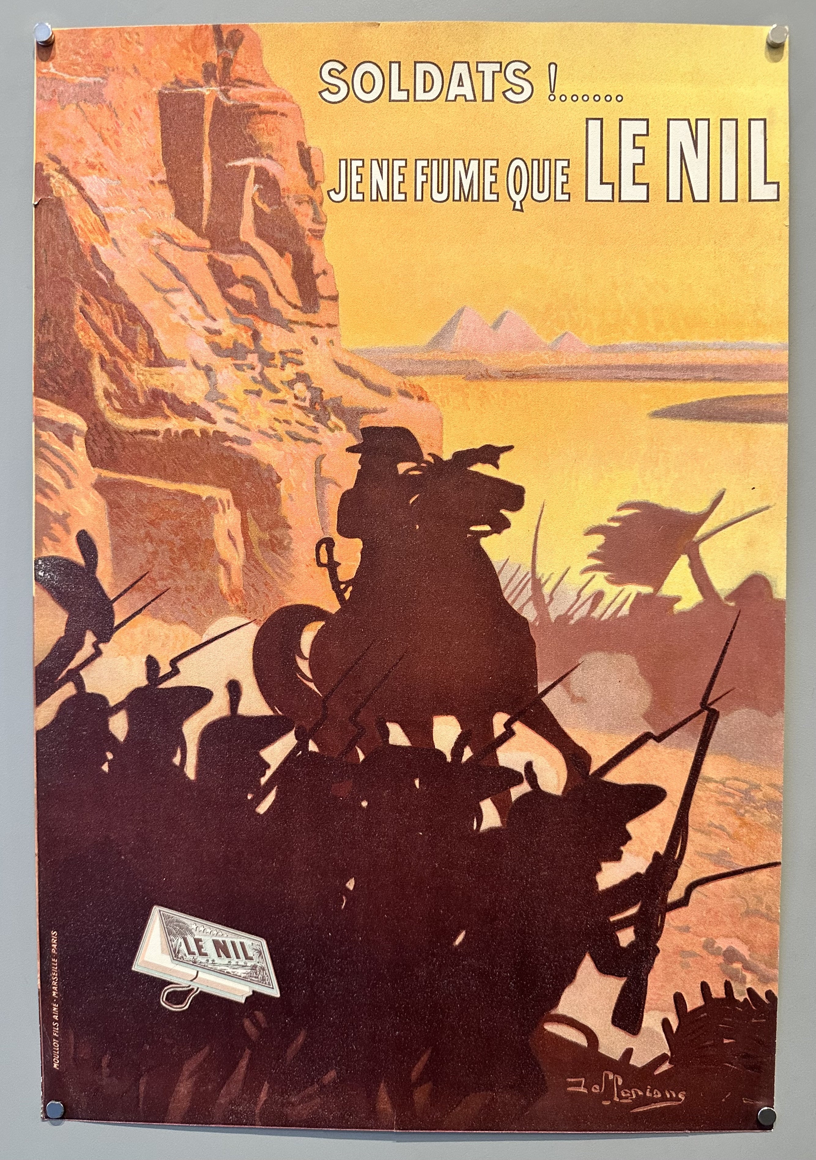 This funky advertisement for the cigarette brand, the Nile, shows soldiers in Egypt being directed by their general to smoke Niles. The sunset colors make this quite a beautiful poster.
