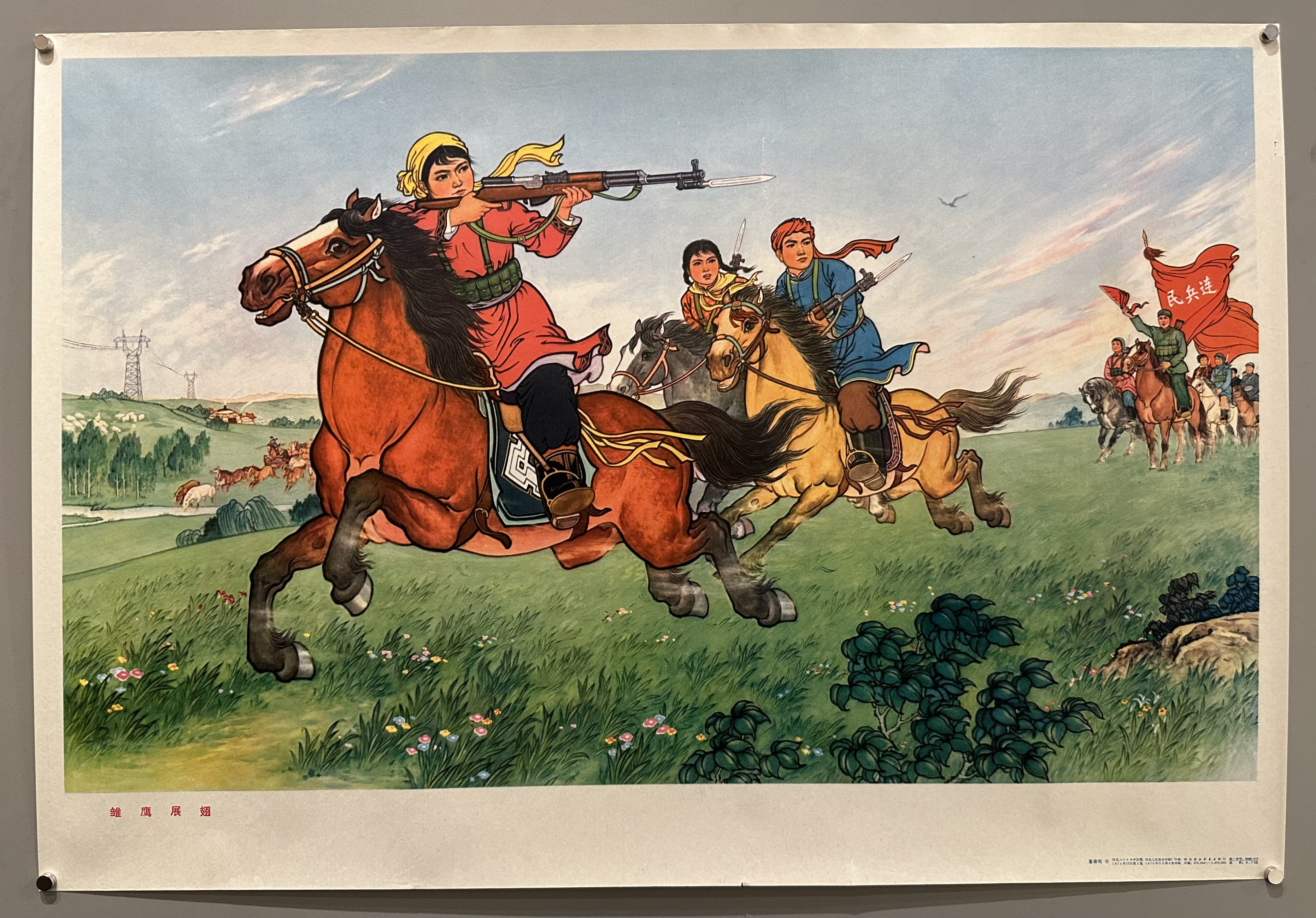 Soldiers use modern weaponry to fend off enemies in Chinese propaganda poster that is meant to highlight the country's self-reliance and progressiveness during Mao's rule.