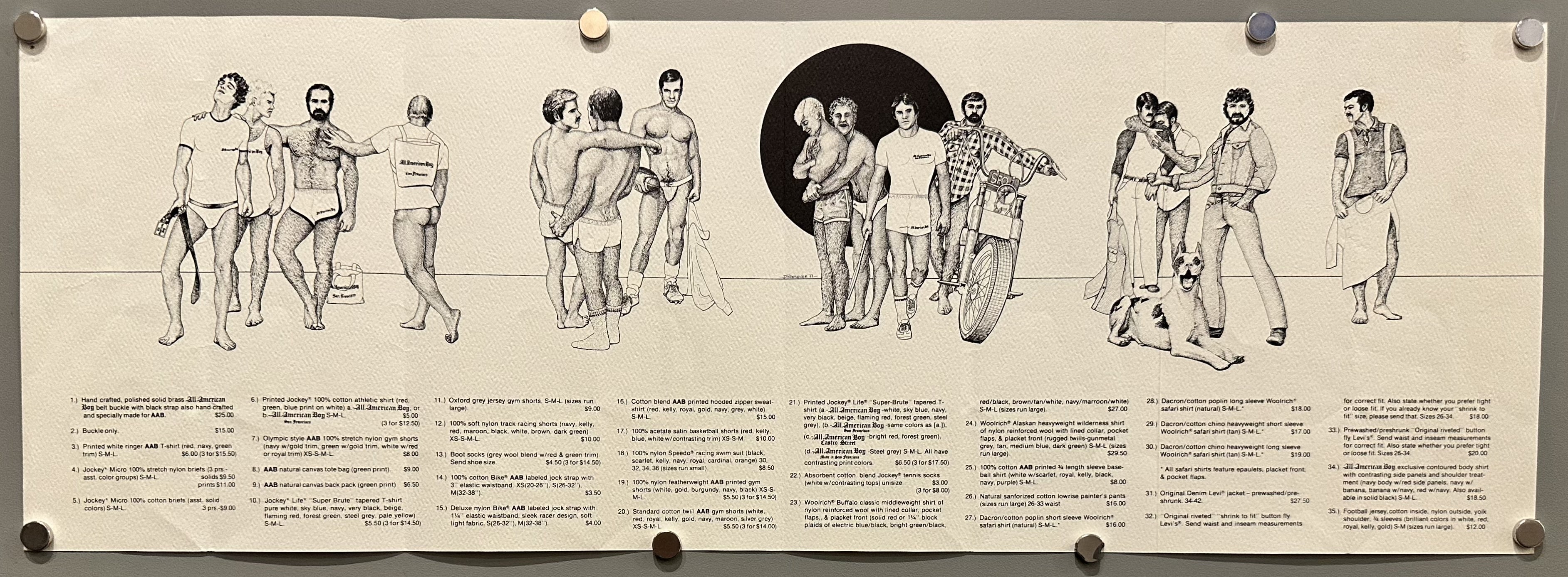 Advertisement for clothing from "the quintessential Castro clothing shop." Featured are gay men in jockstraps, Levi's, t-shirts, and tote bags.