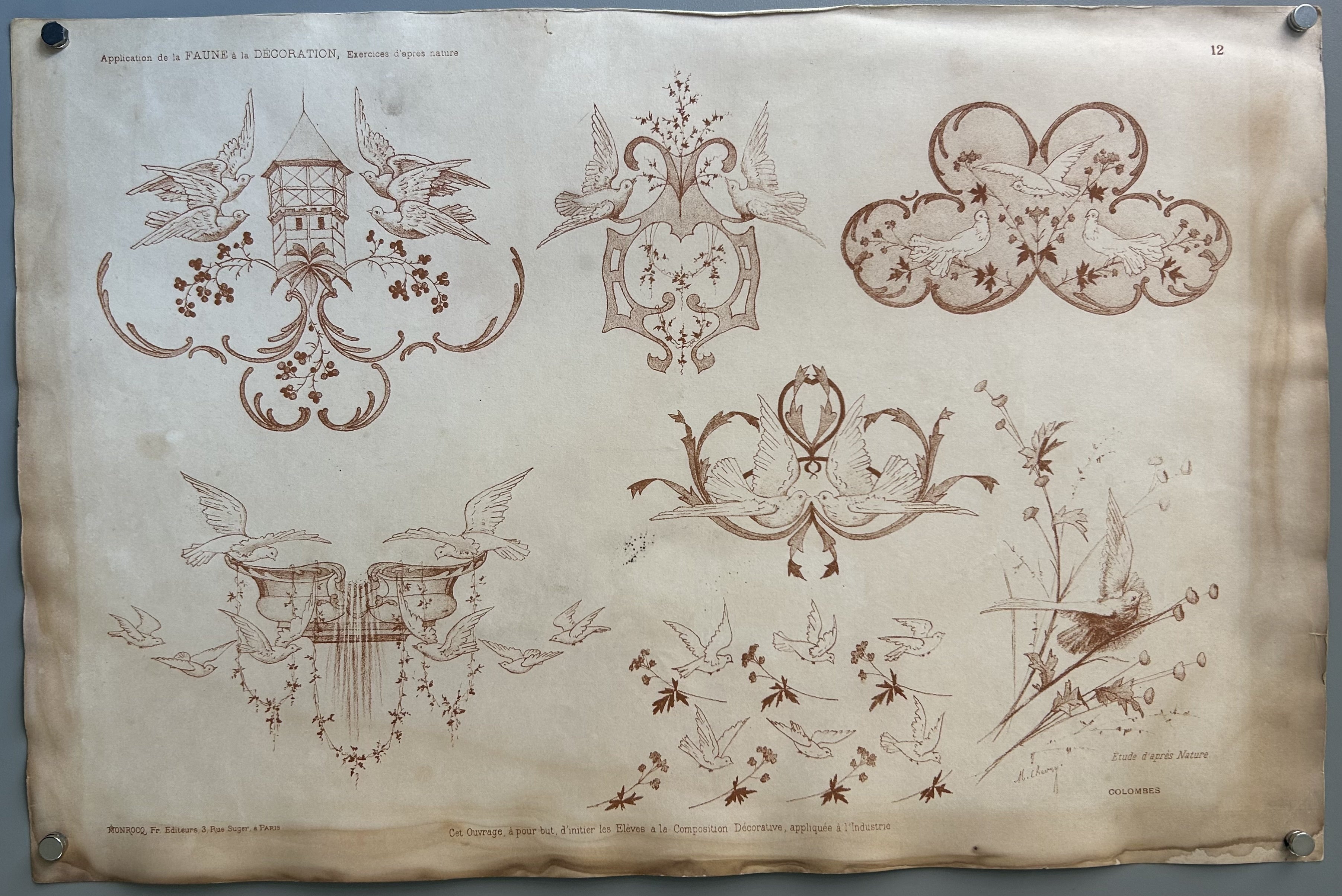A turn-of-the-century series of original prints highlighting decorative arts, this one specifically depicting doves.