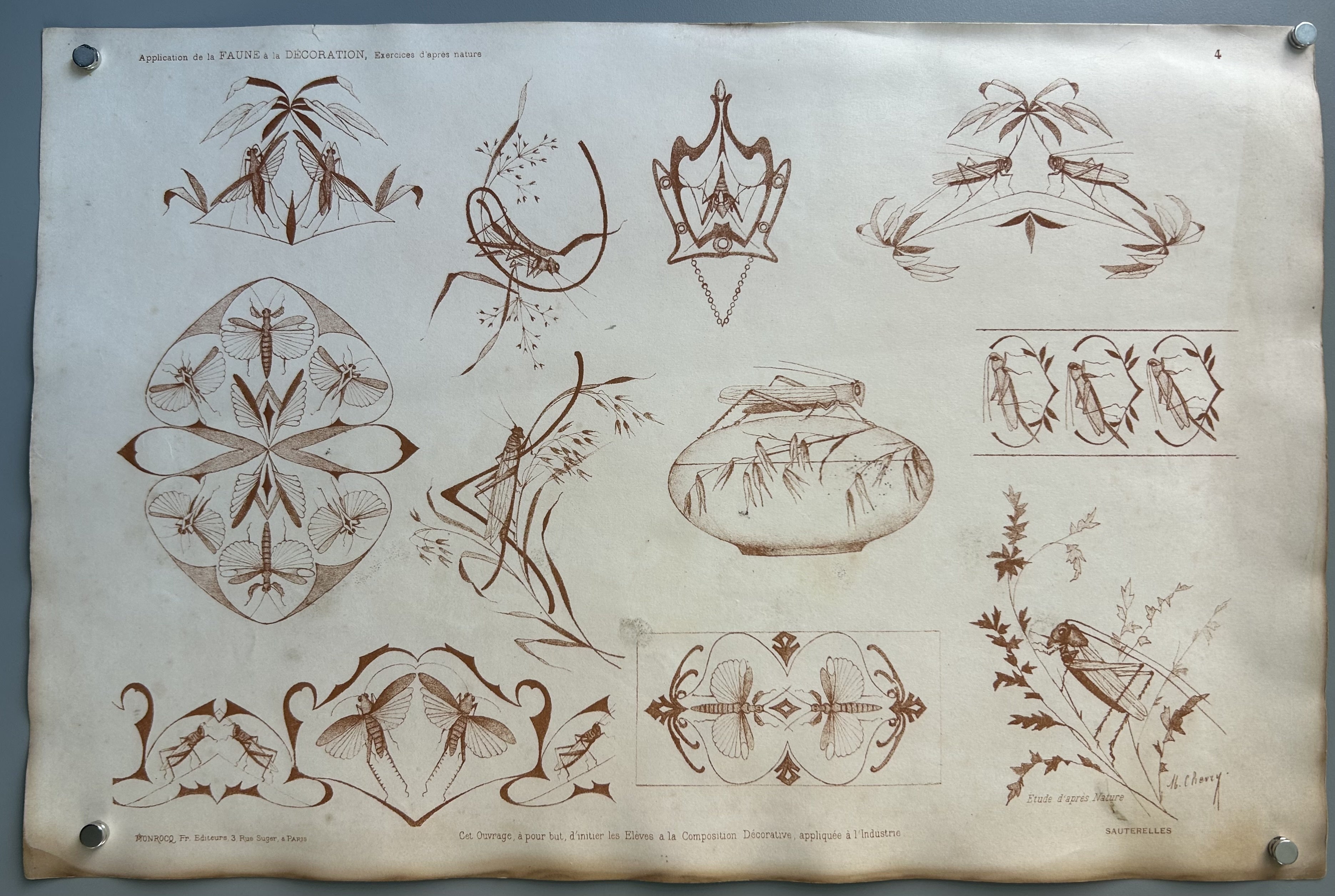 A turn-of-the-century series of original prints highlighting decorative arts, this one specifically depicting grasshoppers.
