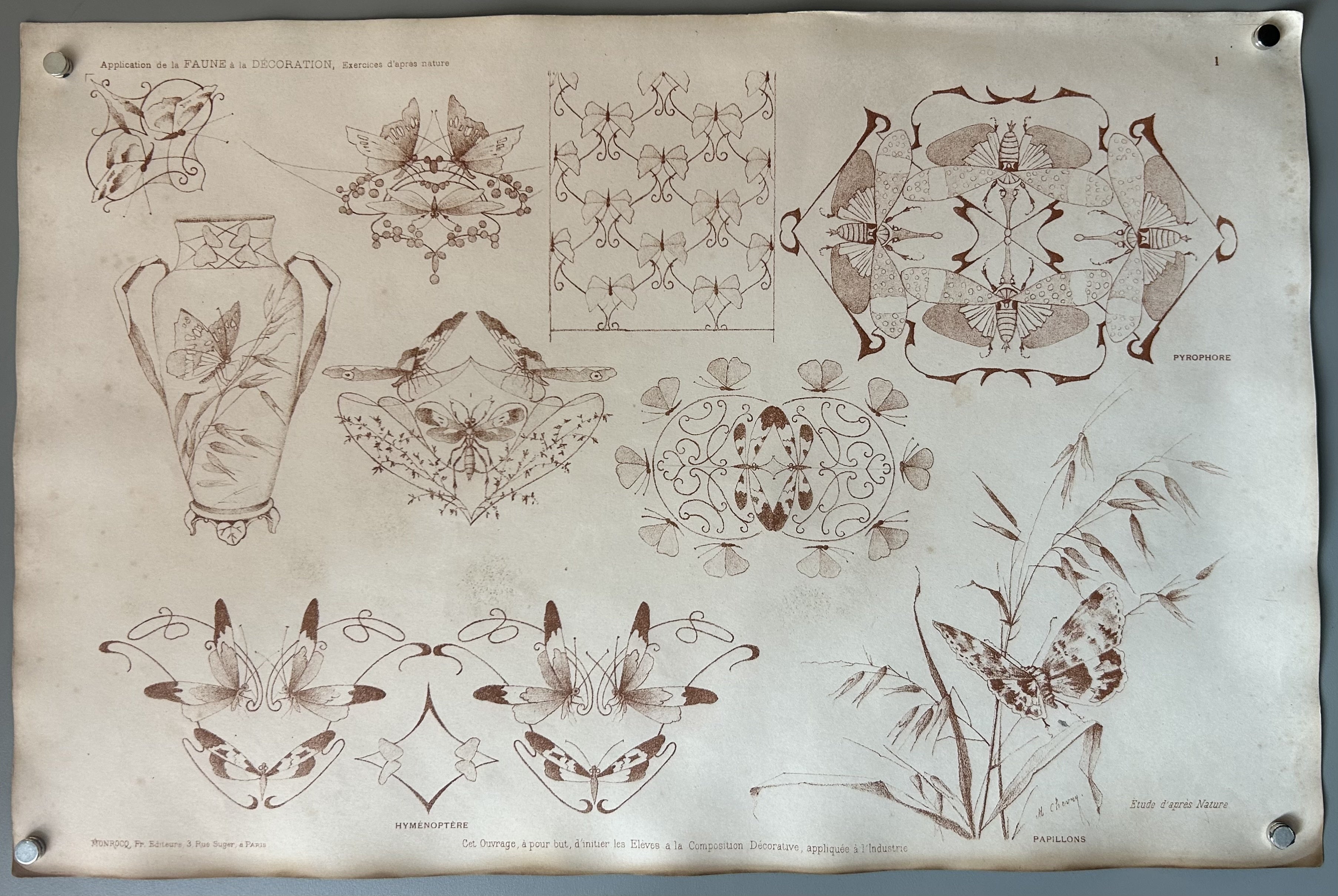 A turn-of-the-century series of original prints highlighting decorative arts, this one specifically depicting dragonflies, butterflies, and moths.
