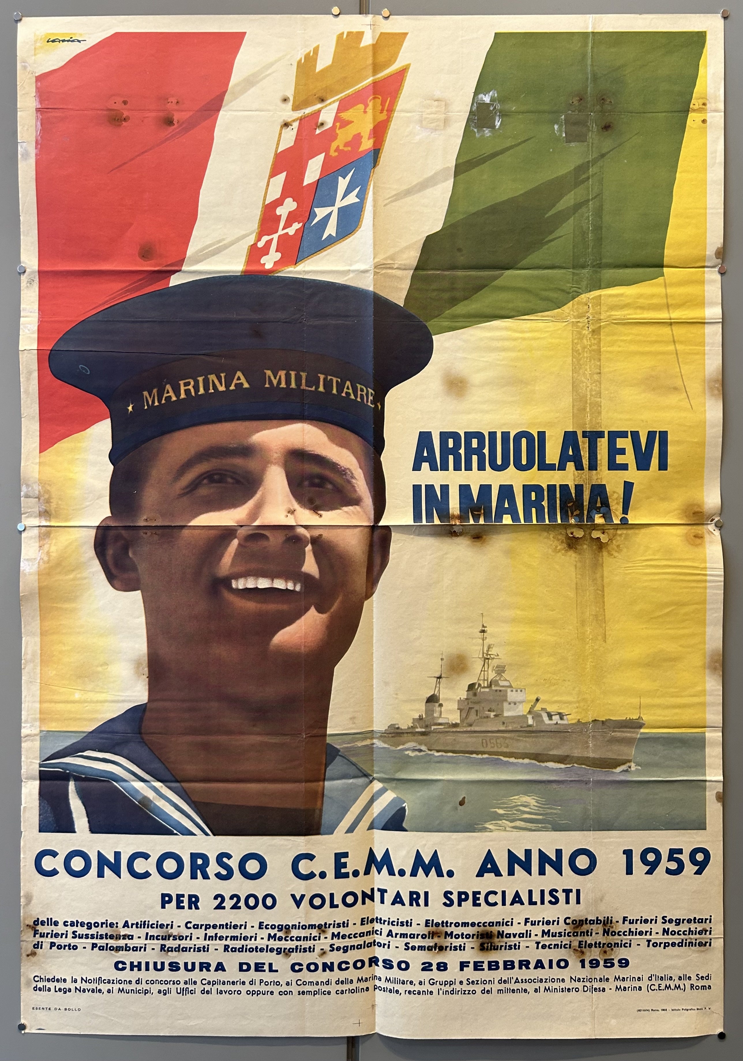 Italian poster encouraging enlistement in the navy. Text at the bottom lists different ways to be involved: carpentry, electric work, mechanic work, etc.
