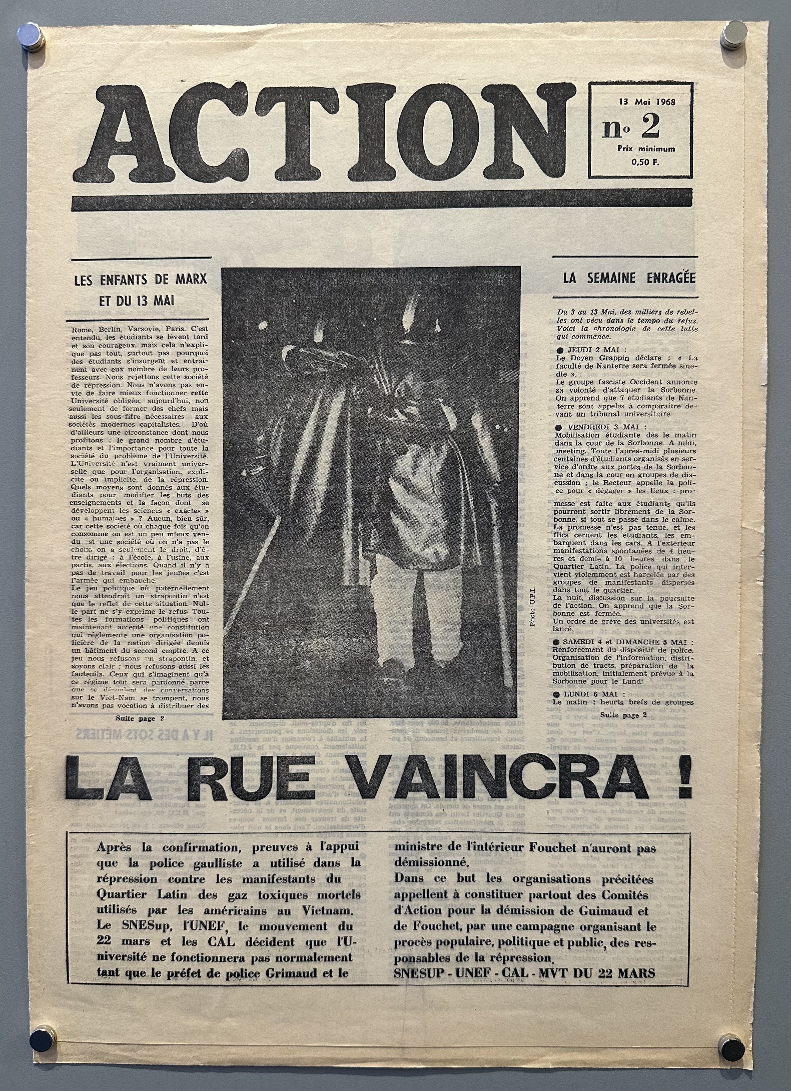 Action newspaper was created by a few Union of Communist Students (UEC). 50,000 copies of the first edition of the newspaper were sold in the street during the demonstration on Tuesday, May 7, 1968. Action stopped publishing definitively on June 2, 1969, after 46 issues. Jean Pierre Vigier was the director, with his name found on the backside of the paper.