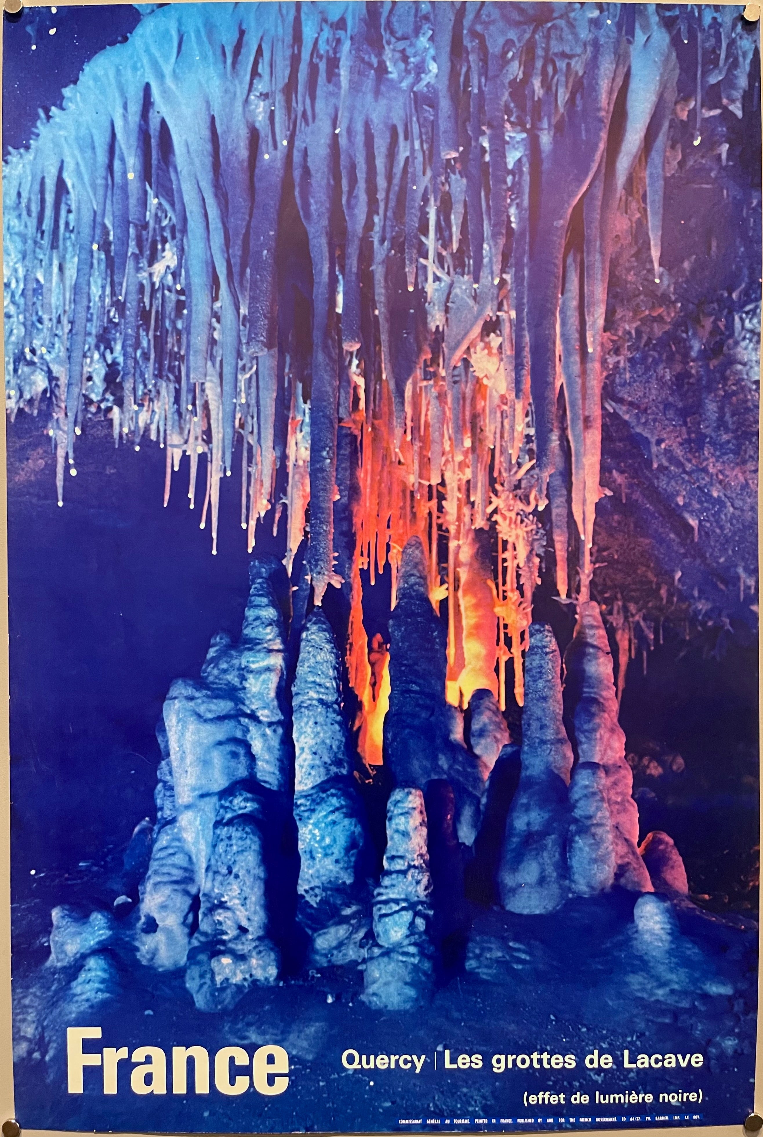 A travel poster promoting tourism to Quercy, France to see the Grottes de Lacave. It features a colorful photo of the caves illuminated at night.