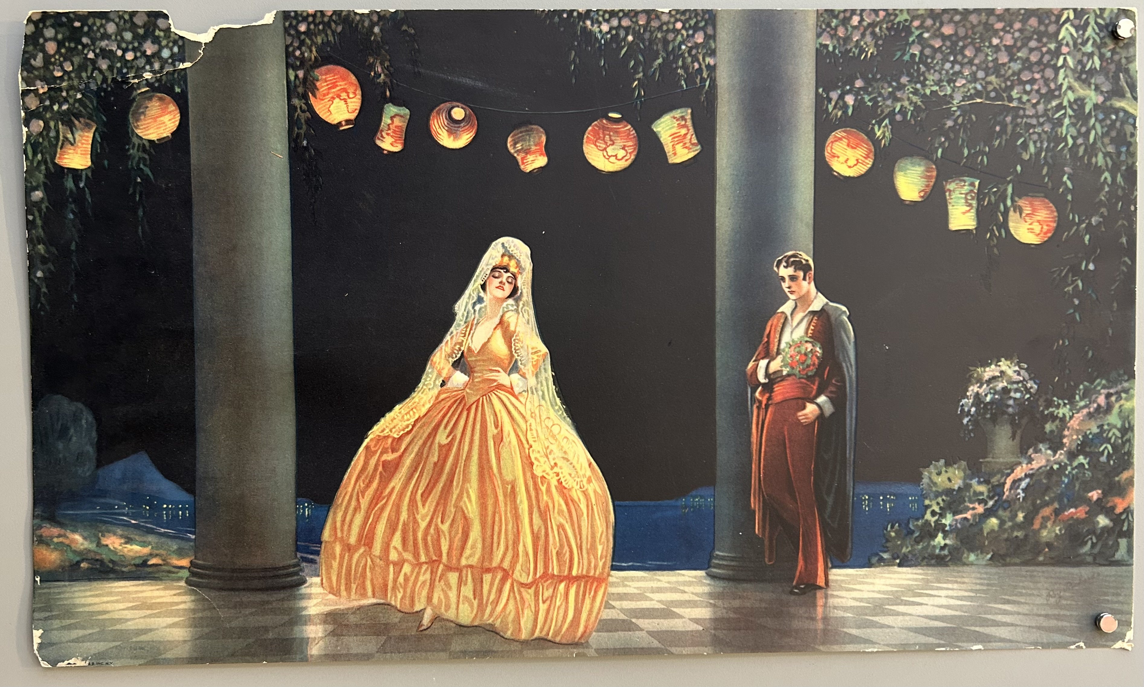 A gorgeous theatrical scene shows a woman in a lavish orange ball gown, her suitor holding a bouquet. Together they stand under lamplight, the vast harbor in the background.