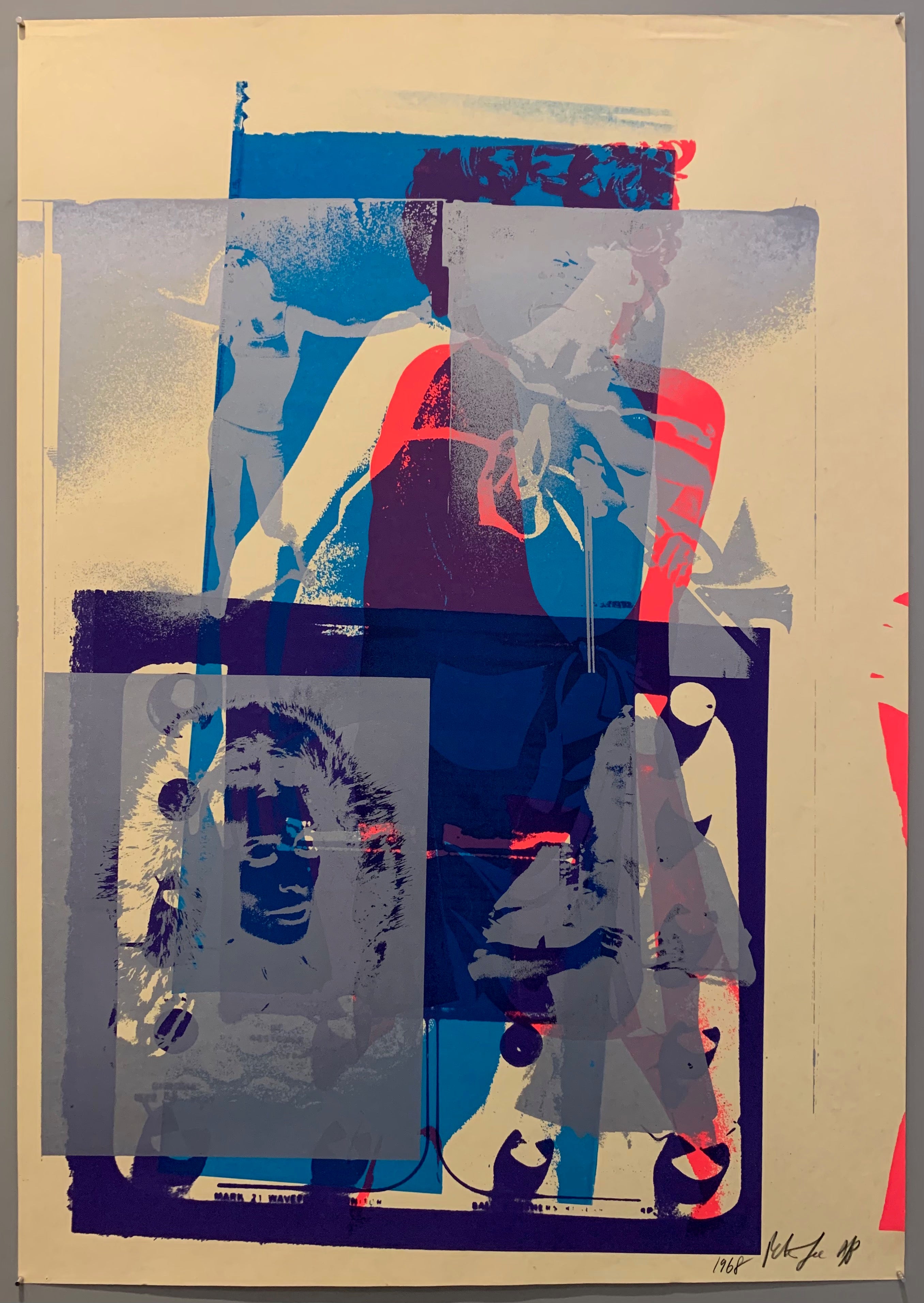 Original silkscreen print by artist Peter Gee. An overlay of images creates a bold and vivacious scene. Here we see the shadows of several women, some dancing or singing, and many more abstract photos and designs. The vivid neon colors of this print make it all-the-more eye-catching. Fashion designer Betsey Johnson and Peter Gee were friends as well as collaboraters. Johnson were both known for their whimsical patterns, making their works done together incredibly bright and dramatic. Along with Johnson, Penelope Tree also modeled in these, and other prints of Gee's. Not only was this print series important in the pop art era, but the outlined figures filled with movement clearly had an influence over the colorful Apple iPod silhouette posters from the 2000s.