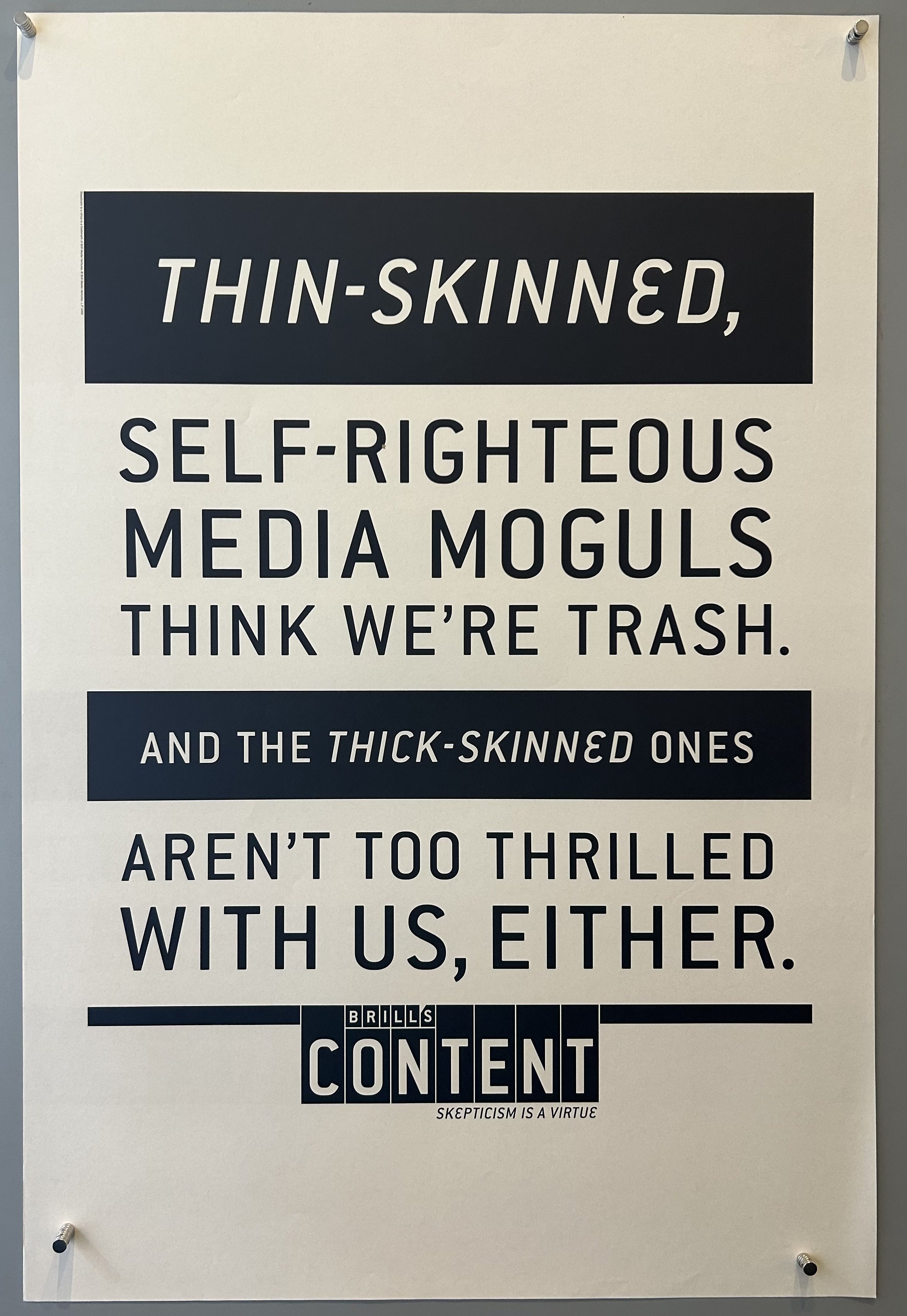 Part of an advertising series for Brill's Content, a media watchdog publication published in 1998 by Steven Brill. The magazine caused a stir in its very first issue, with Brill's article titled "Pressgate" charging that independent counsel Ken Starr and his office had been the source of much of the information for reporters regarding the grand jury proceedings about the Lewinsky scandal and that as a result, Starr may have violated federal law or ethical and prosecutorial guidelines. The publication became less associated with Brill after its founding (Wikipedia).