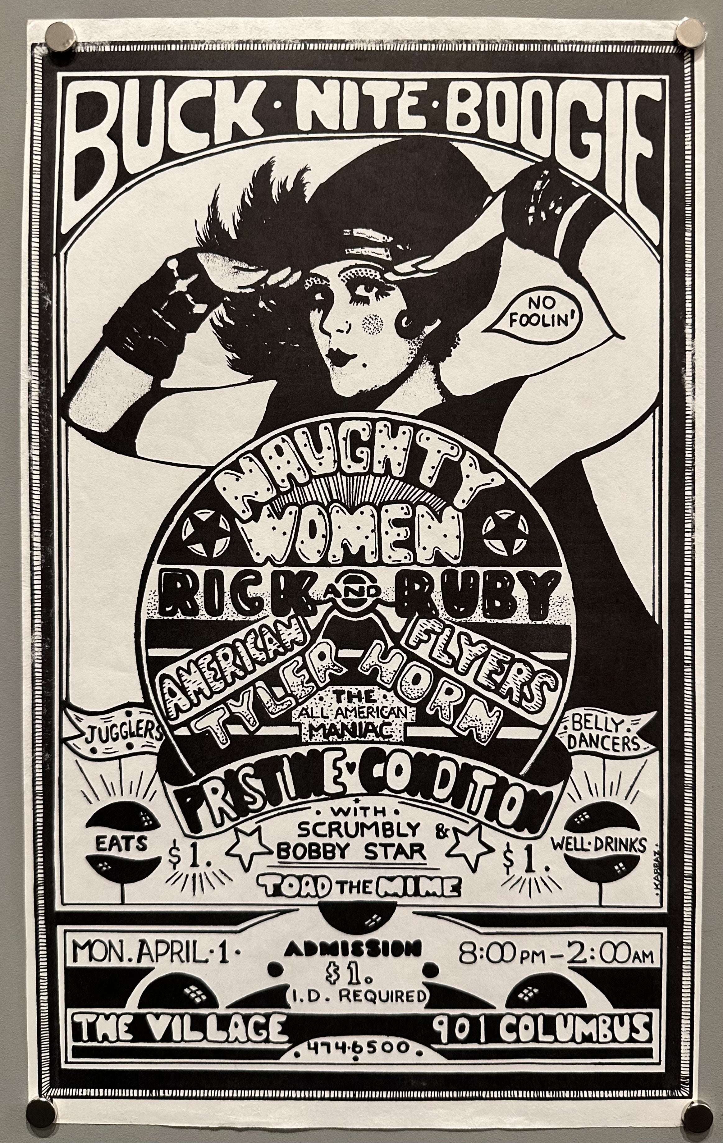 Vintage concert handbill for an event at The Village, featuring various performers including Naughty Women, Rick Ruby, and Toad the Mime.