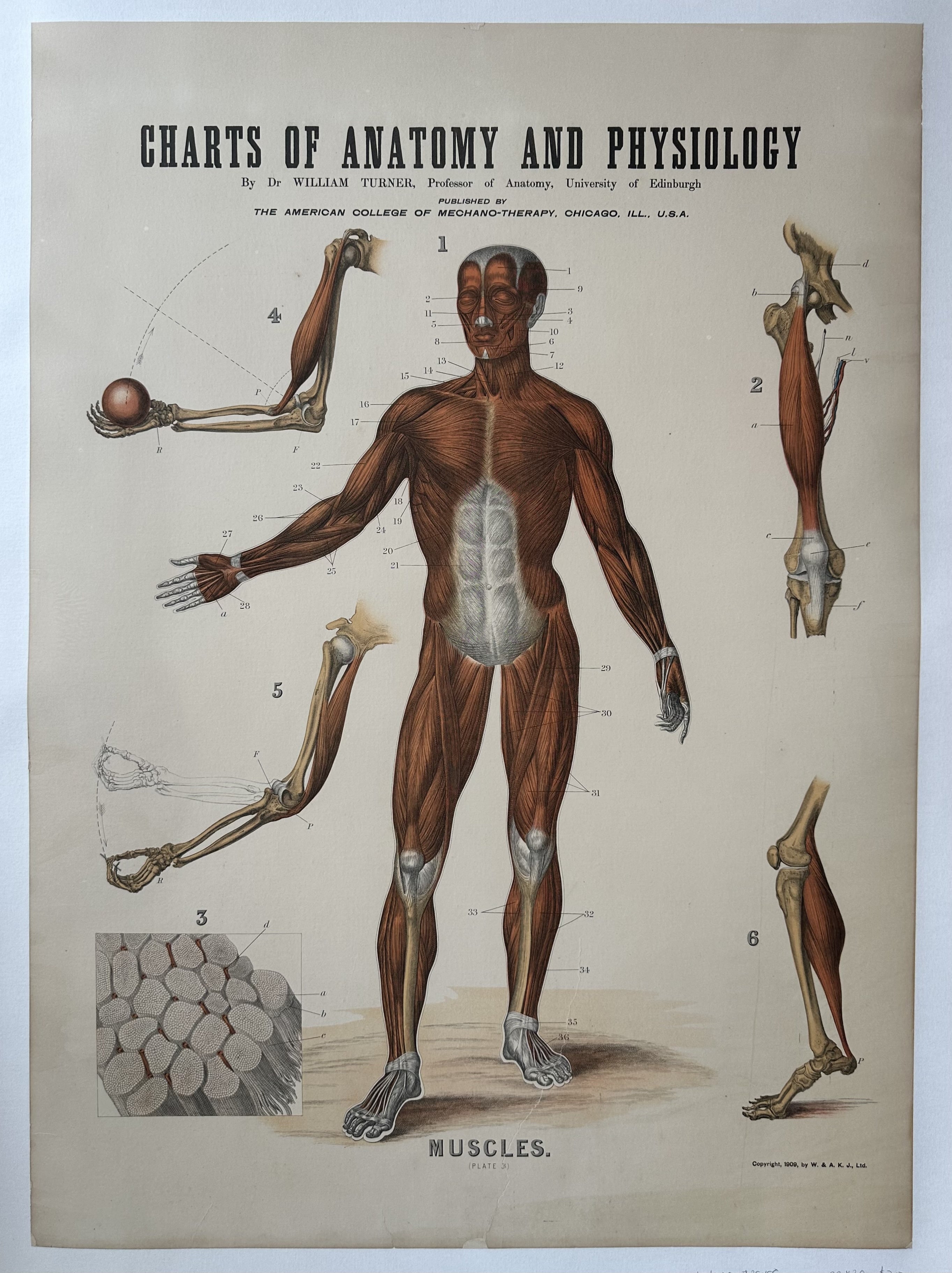 One of a series of eight anatomical charts produced by anatomist Dr William Turner while he was working at Scotland's Edinburgh University. Published by the American College of Mechano-Therapy in Chicago. The imagery was used as teaching aids all over the world. Original diagrams copyrighted by W. & A.K. Johnson, Ltd. Available in other sizes elsewhere on our website.