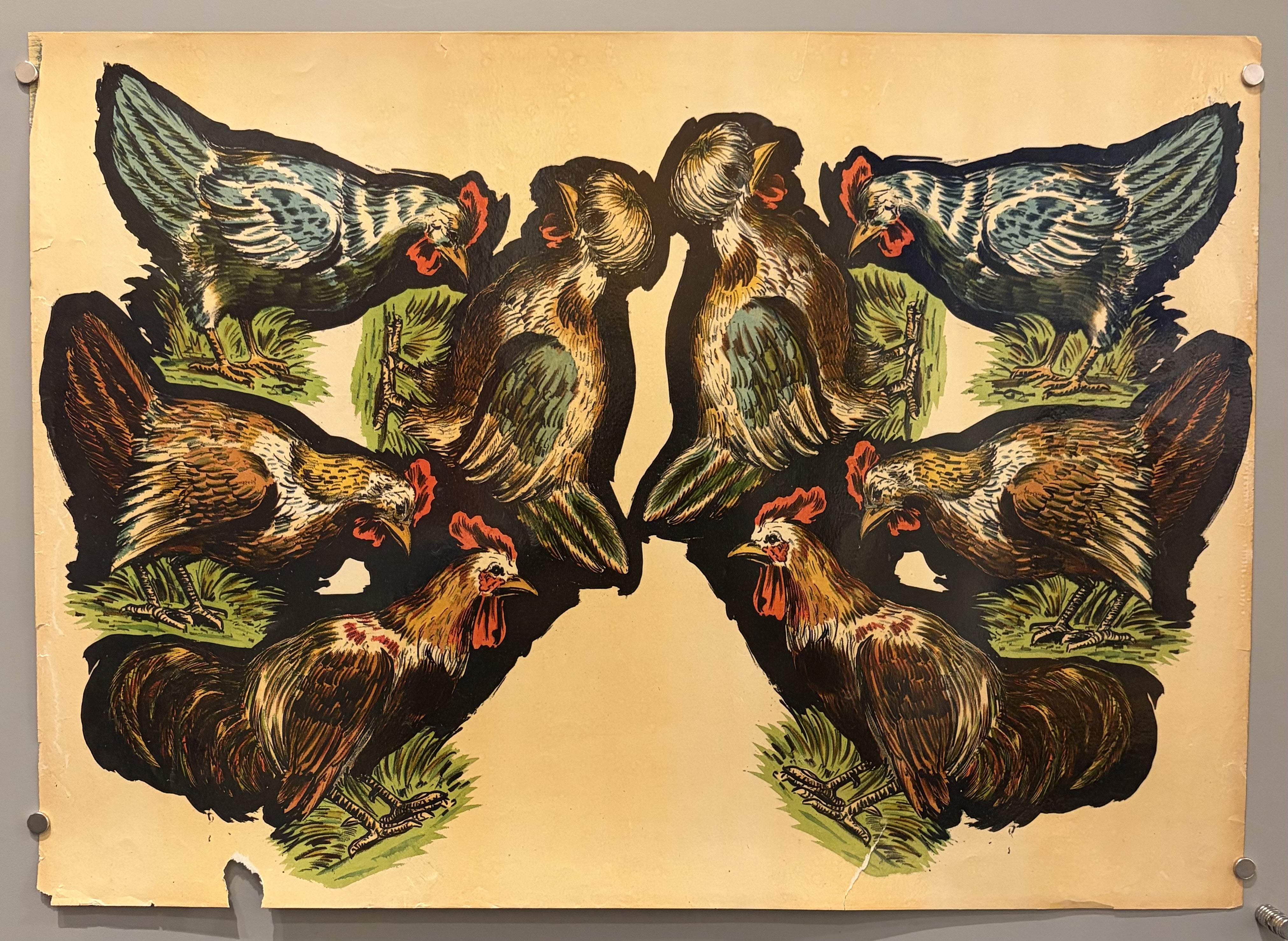 This turn-of-the-century print would have been cut out and folded in half to create a double-sided tableau of chickens and roosters.