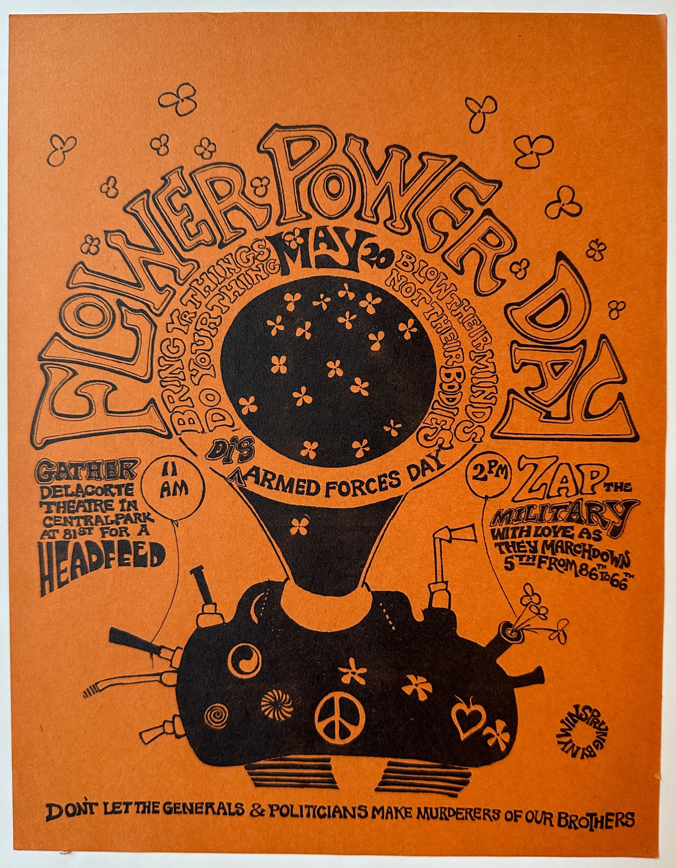 "FLOWER POWER DAY / BRING YR THINGS / DO YOUR THING / MAY 20 / BLOW THEIR MINDS / NOT THEIR BODIES / DIS^ARMED FORCES DAY / 11AM / 2PM / GATHER / DELACORTE / THEATER IN / CENTRAL PARK / AT 81ST FOR A / HEADFEED / ZAP THE / MILITARY / WITH LOVE AS / THEY MARCH DOWN / 5TH FROM 86TH TO 66TH / DON'T LET THE GENERALS & POLITICIANS MAKE MURDERERS OF OUR BROTHERS"