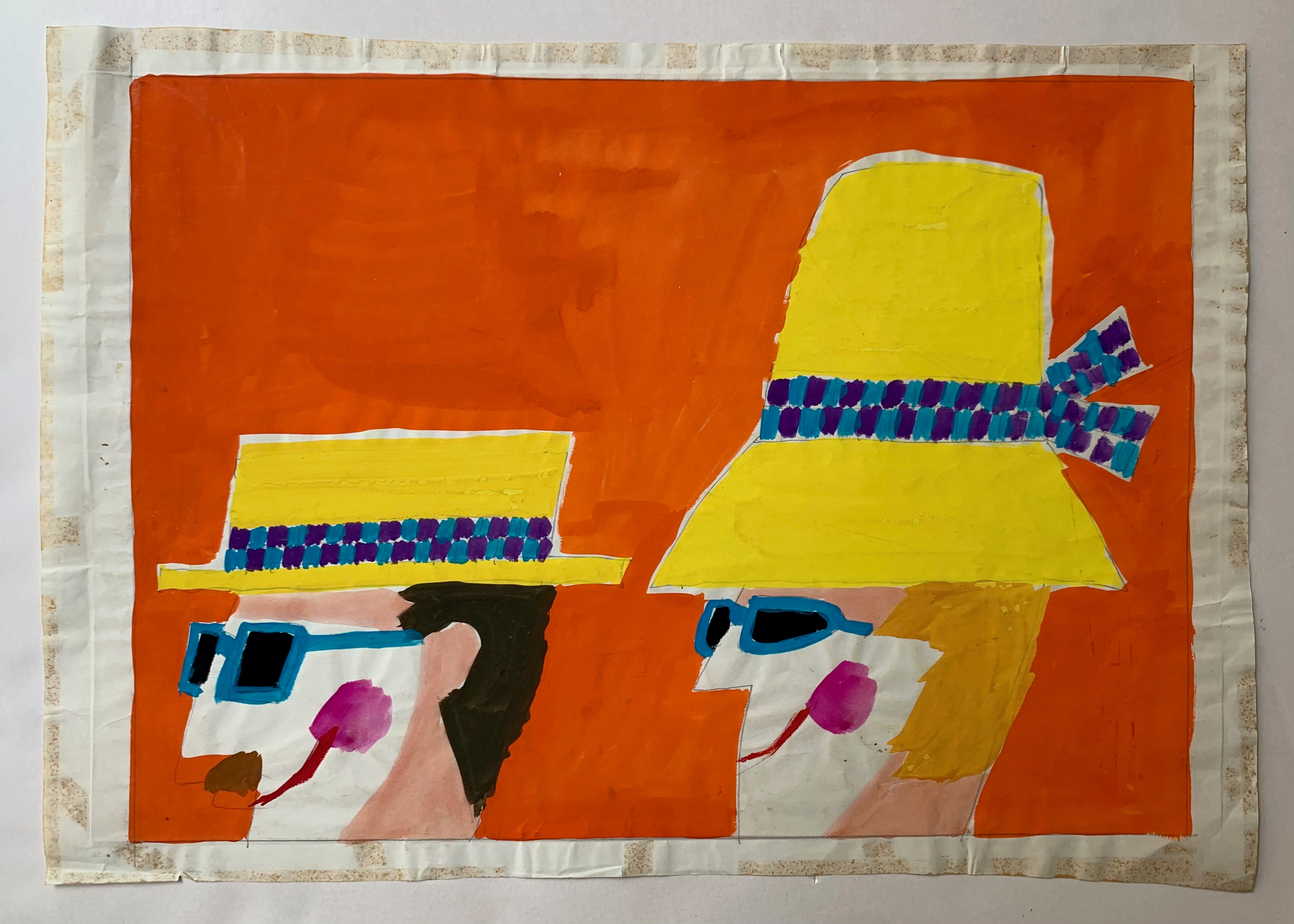 Image: Horizontal painting of a couple facing the left-hand side (left profiles showing). The image is set against an orange background with both of them smiling, wearing blue sunglasses, and yellow hats, although the man closer to the right-hand side's hat is taller.