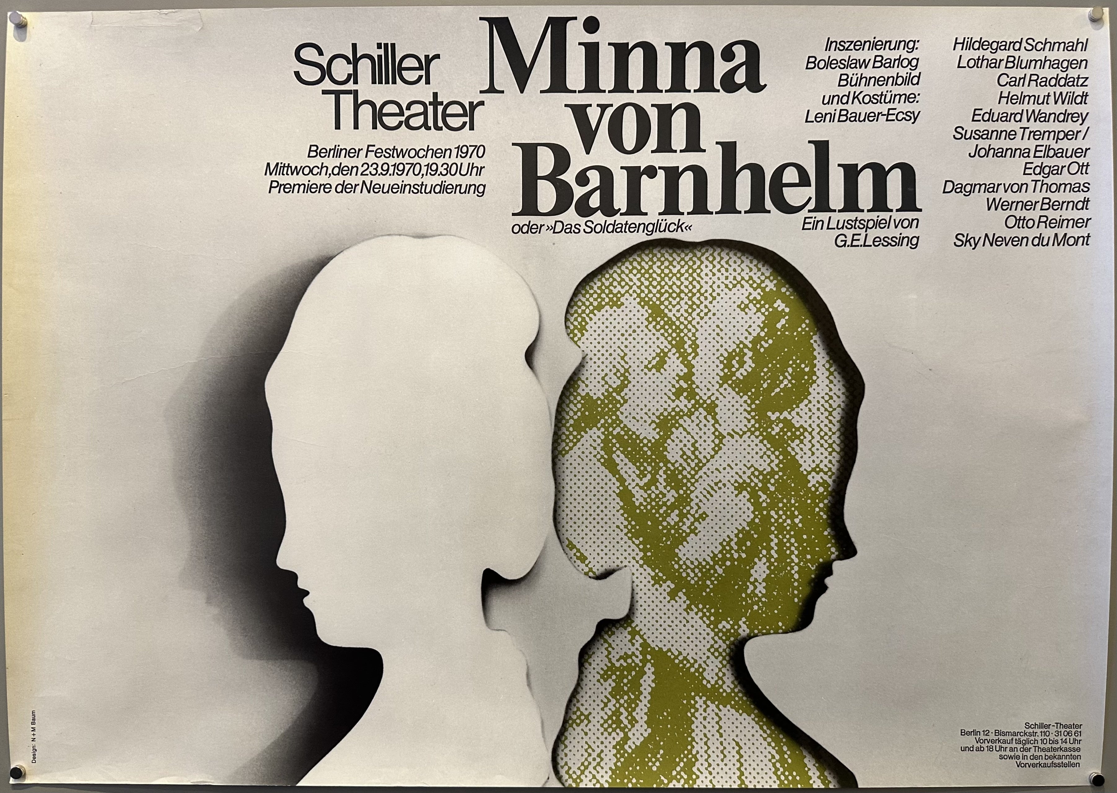 English translation: "Schiller Theater / Berliner Festwochen 1970 / Minna von Barnhelm or 'Das Soldatenlück' / A comedy by G.E. Lessing / Direction: Boleslaw Barlog, set and costumes: Leni Bauer-Ecsy"
