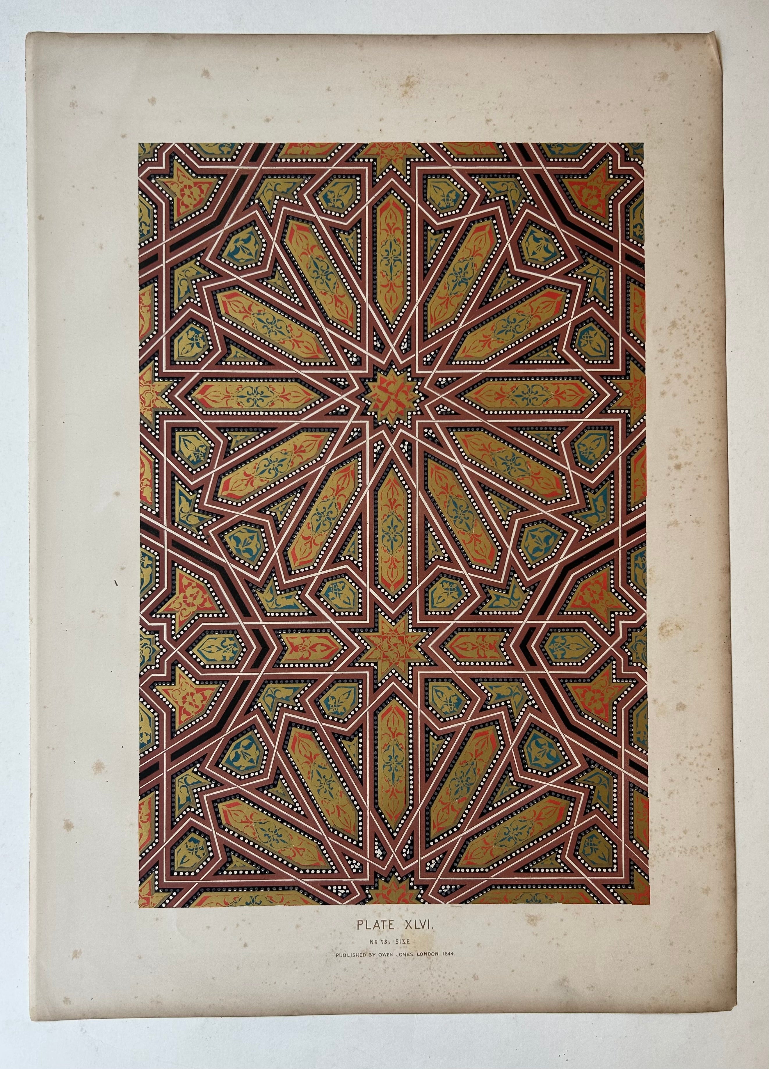 This print comes from a compilation of plans, elevations, sections and details or the famous Alhambra. The Alhambra is a feat of Islamic architecture, a palace in Grenada, Spain. This book was created from the drawings of architects Jules Goury and Owen Jones. Jones was known for his eye for design and is often attributed with being a pioneer of modern color theory. His attention to detail is recognized in his works in this compilation. The works of Goury included in this compilation were drawings done on site at the Alhambra in 1834.